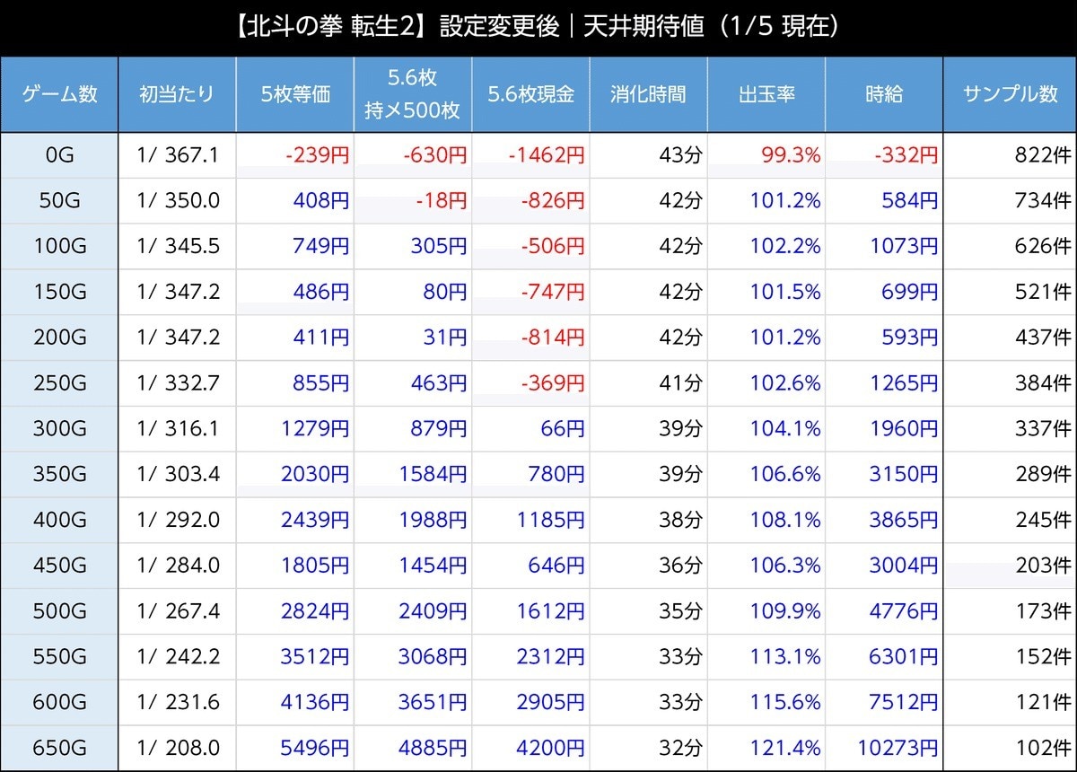 北斗転生2スマスロの朝一リセット時の天井期待値は、等価交換は50Gから、5.6枚交換は300Gからプラス域です。1,000円以上の期待値を狙う場合は、等価交換なら300G、5.6枚交換であれば500Gから打ちましょう。