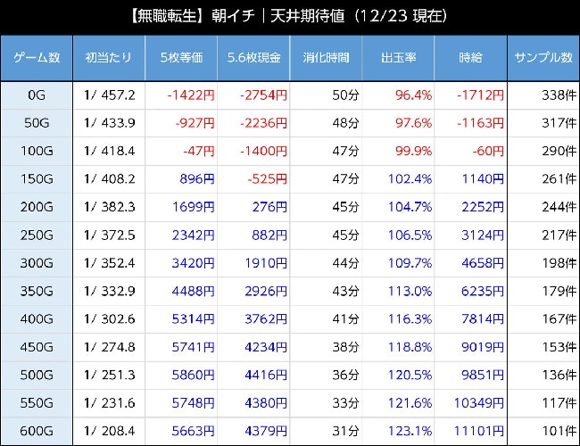 無職転生スマスロの朝一リセット時の天井期待値は、等価交換は150Gから、5.6枚交換は200Gからプラス域です。1,000円以上の期待値を狙う場合は、等価交換なら200G、5.6枚交換であれば300Gから打ちましょう。