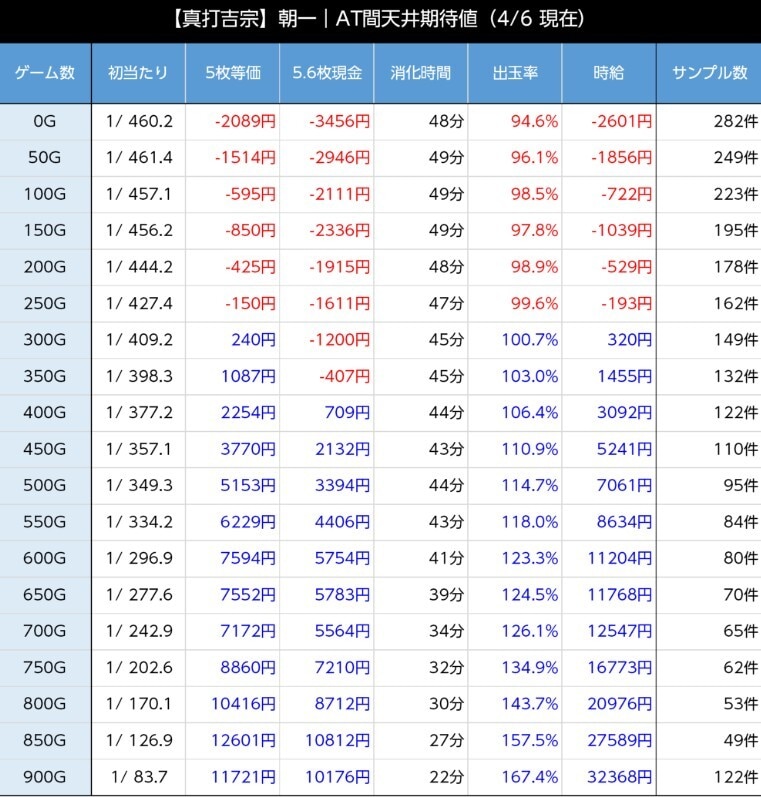 真打吉宗スマスロの朝一(リセット時)の天井期待値は、等価交換が350G、5.6枚交換なら450Gから1,000円以上の期待値が発生します。天井短縮の影響で、浅めのゲーム数から狙えます。