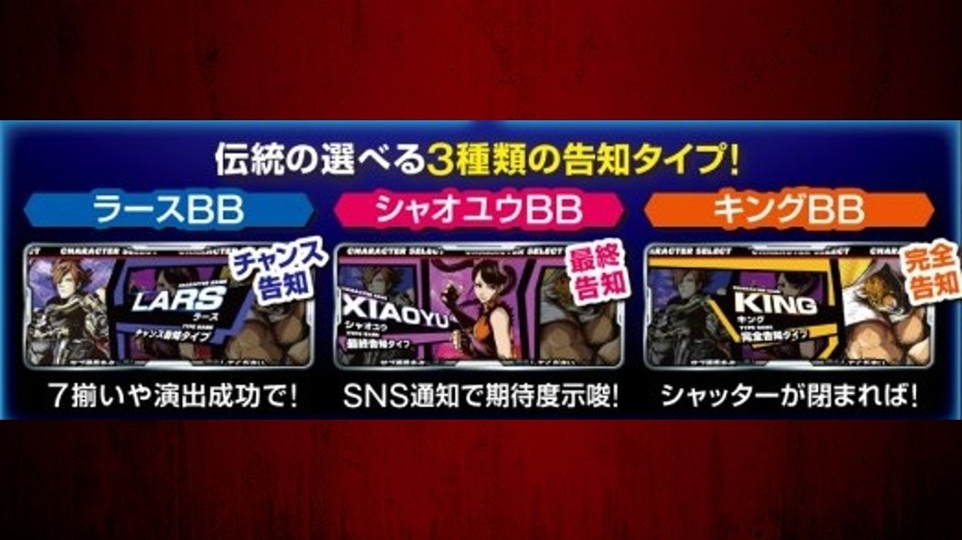 スマスロ鉄拳6のボーナスは、青7揃いのみ告知タイプを選択できます。告知タイプは「チャンス告知(ラース)」「最終告知(シャオユウ)」「完全告知(キング)」から選べるので、好みの告知タイプで楽しみましょう。