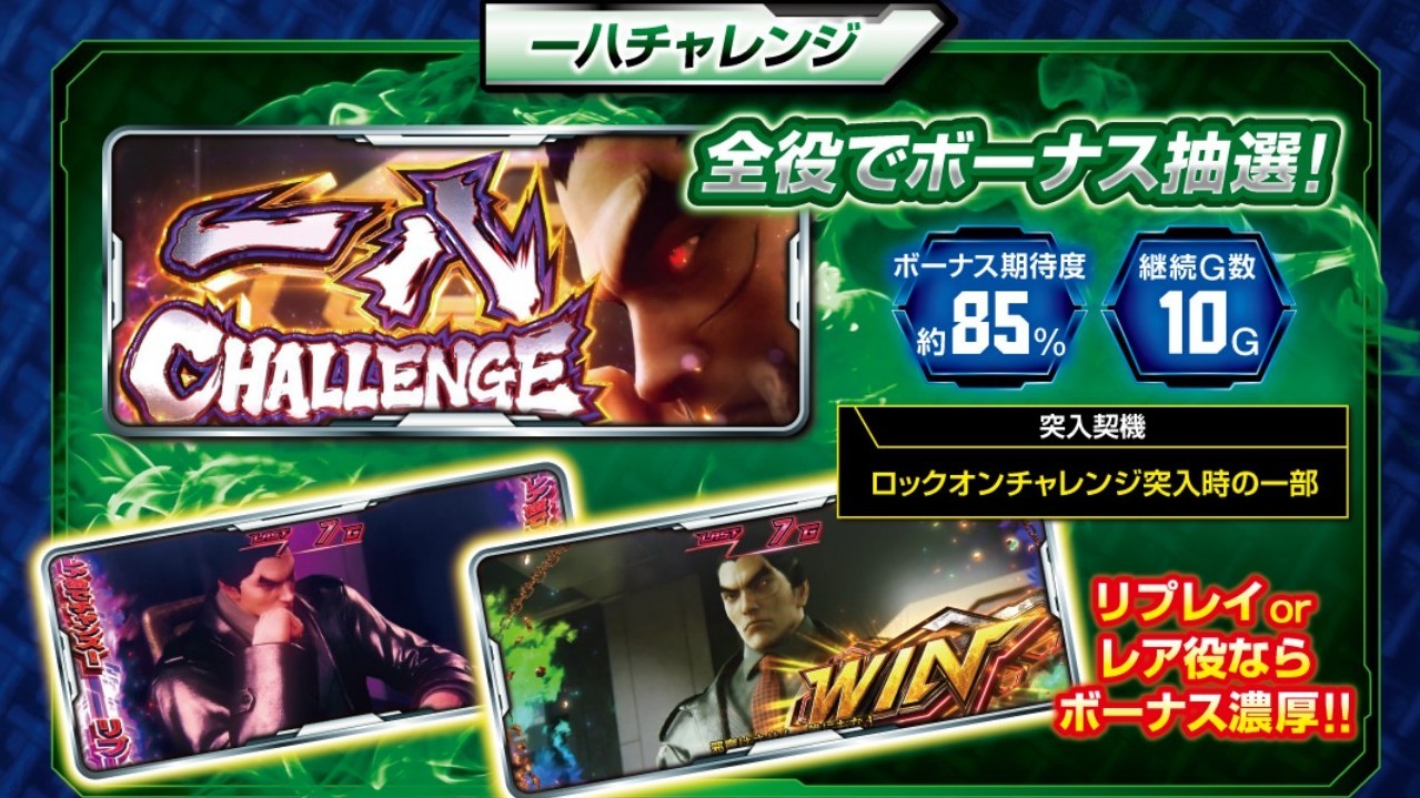 スマスロ鉄拳6の一八(かずや)チャレンジは、ボーナス当選をかけた上位CZです。ロックオンチャレンジよりも成功期待度が高く、リプレイやレア役なら成功濃厚なのでボーナス当選に期待しましょう。