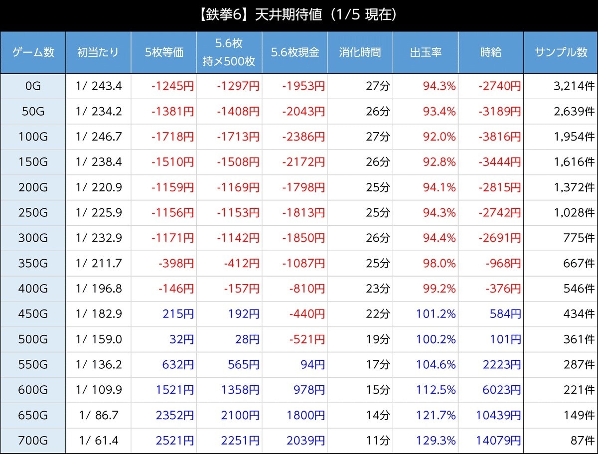 スマスロ鉄拳6のAT後の天井期待値は、等価交換は450Gから、5.6枚交換では550Gから期待値がプラスです。天井の期待値で立ち回る場合、600Gを目安にするのが良いでしょう。