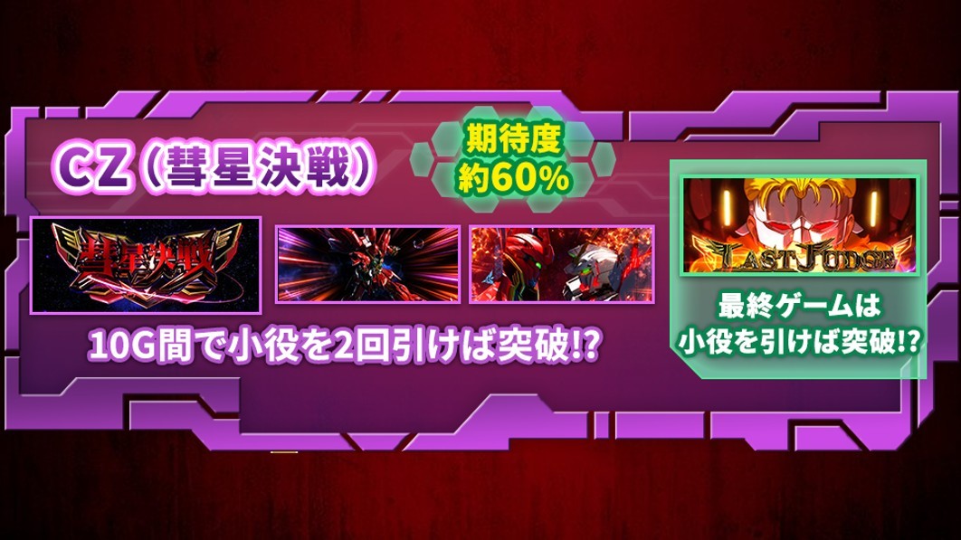 ユニコーン2スマスロ(機動戦士ガンダムUC2-ユニコーン2- 覚醒DRIVE スロット)のCZ彗星決戦をご紹介。突入契機や消化中の抽選、成功期待度、恩恵についても記載しています。
