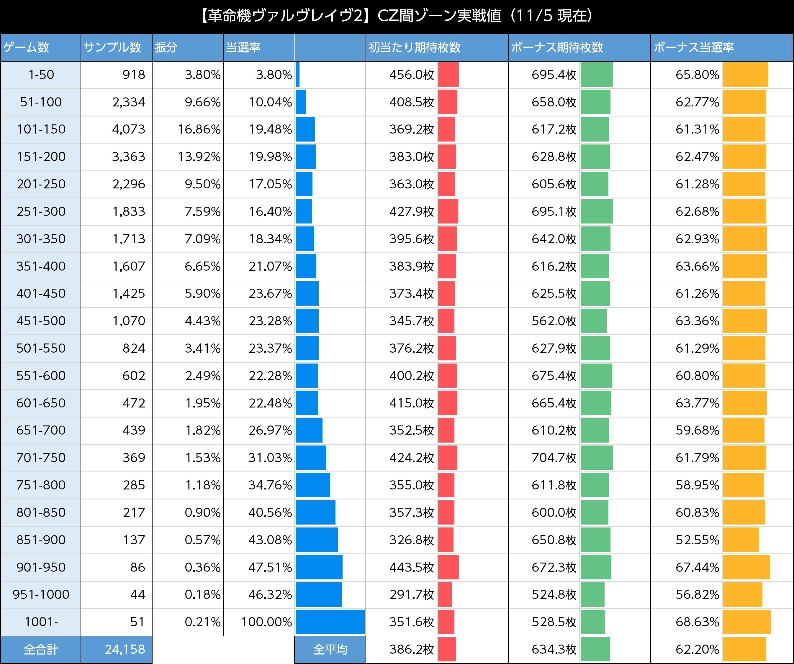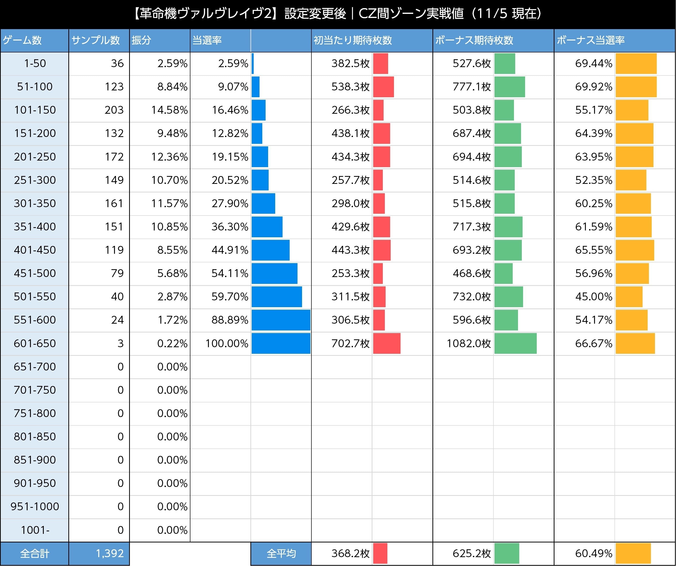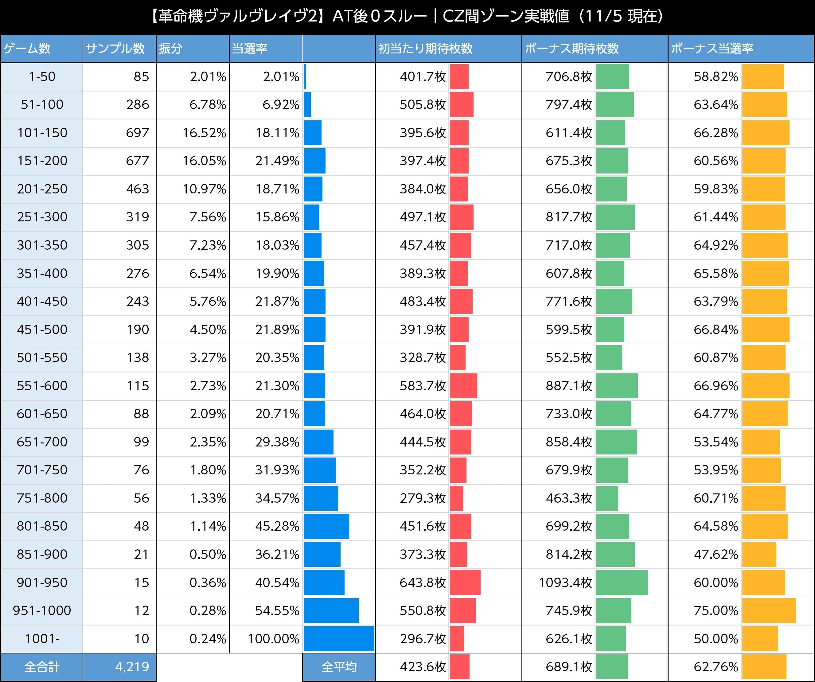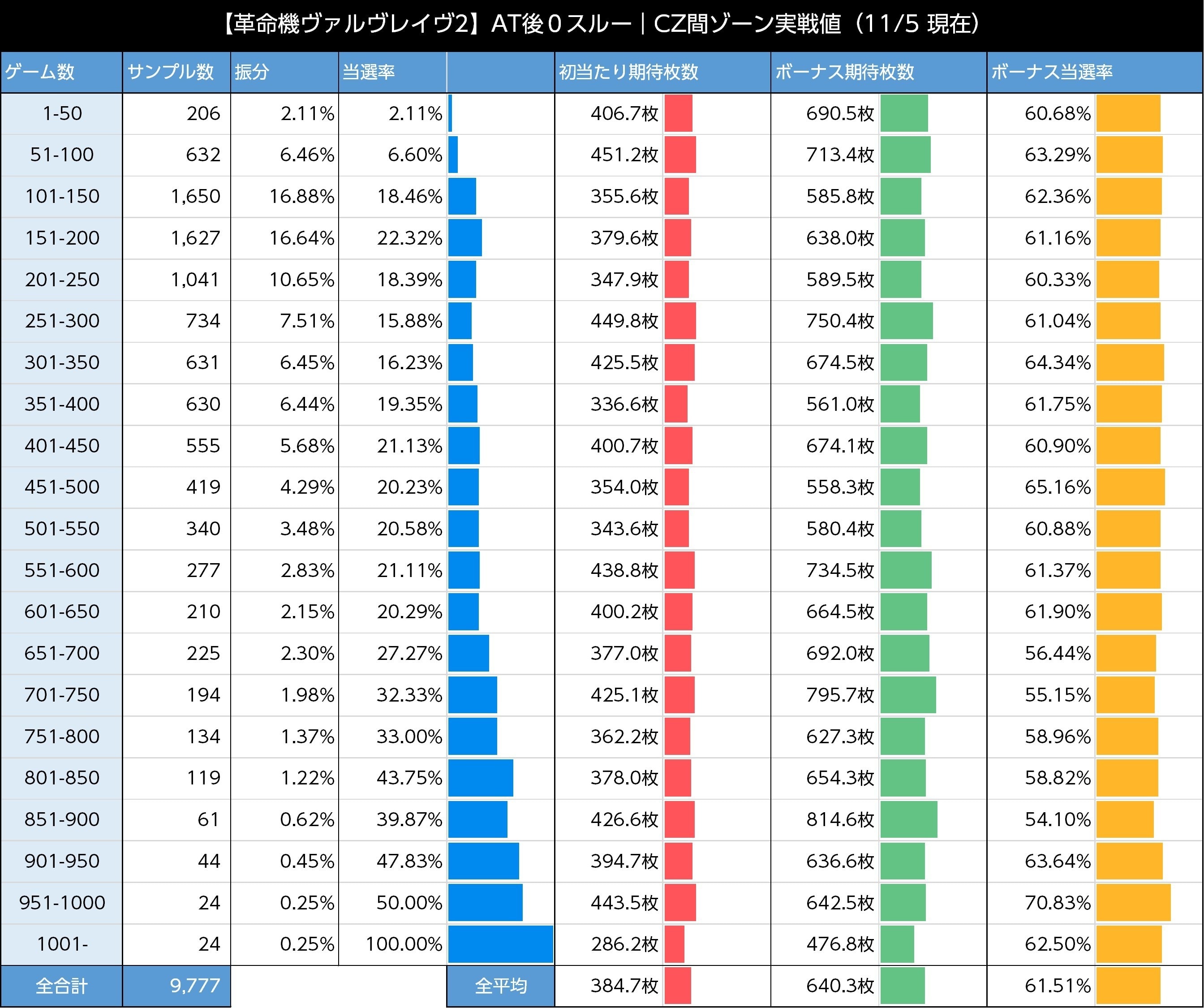 ヴァルヴレイヴ2スロットのAT後0スルー時のCZ間ゾーン期待値は、全状態での期待値と同様に特筆すべきゾーンはありません。650Gを超えたあたりからCZ当選率が上昇するので、CZ間で600~650Gハマってる台は狙っても良いでしょう。