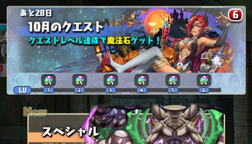 10月のチャレンジダンジョンを全クリアすると、魔法石120個が手に入ります。ダンジョン内容はレベル1~10に加えてEXまでの難易度があり、レベル10、レベル8、EXのみ超重力仕様です。