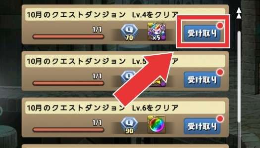 チャレンジダンジョンのクリア報酬は、ダンジョン画面のイベントクエストから受け取る必要があります。ダンジョンをクリアしてもゲーム内メールには届かないので注意しましょう。