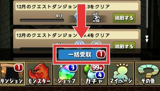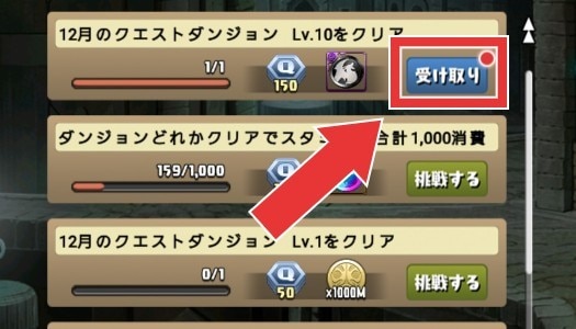| 2 | 拡大する達成したクエストの受取ボタンを押して報酬をゲット※未達成の場合は挑戦ボタンで、対象ダンジョンに移動できる |