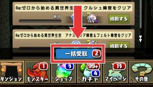 | 2 | 拡大する達成したクエストの受取ボタンを押して報酬をゲット※未達成の場合は挑戦ボタンで、対象ダンジョンに移動できる |
