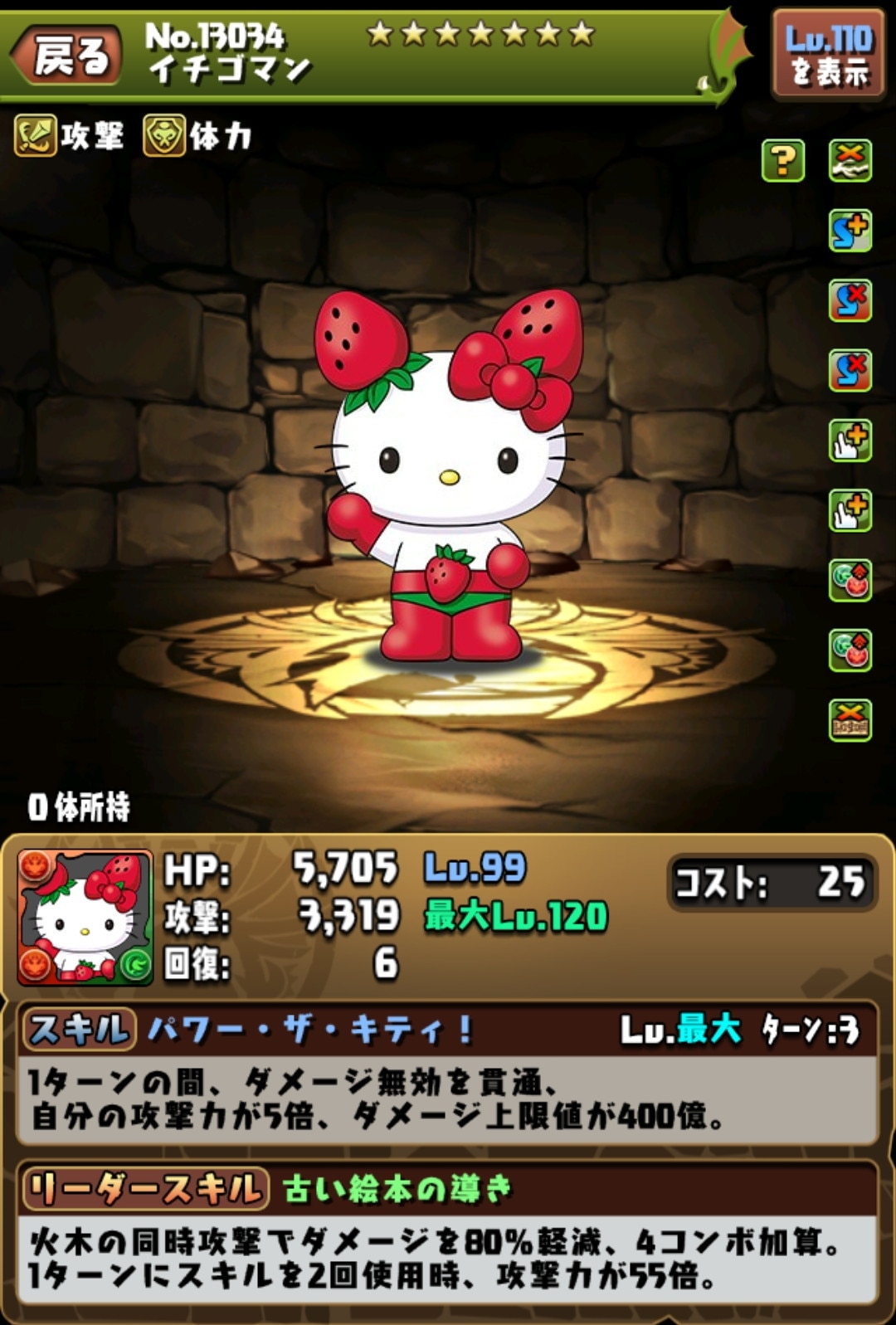 イチゴマンは、サンリオコラボダンジョンでドロップするメダルを集めれば誰でも交換できるので、コラボ期間内にしましょう。3ターンで使える無効貫通と400億解放が特徴のキャラで、一部ランダンなどで活躍が見込めます。