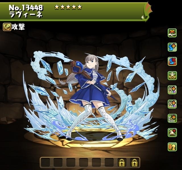 自分と同じ属性のドロップ5個をL字型に消すと攻撃力がかなりアップし、ロック状態を解除する(L字消し攻撃2個分の効果) |