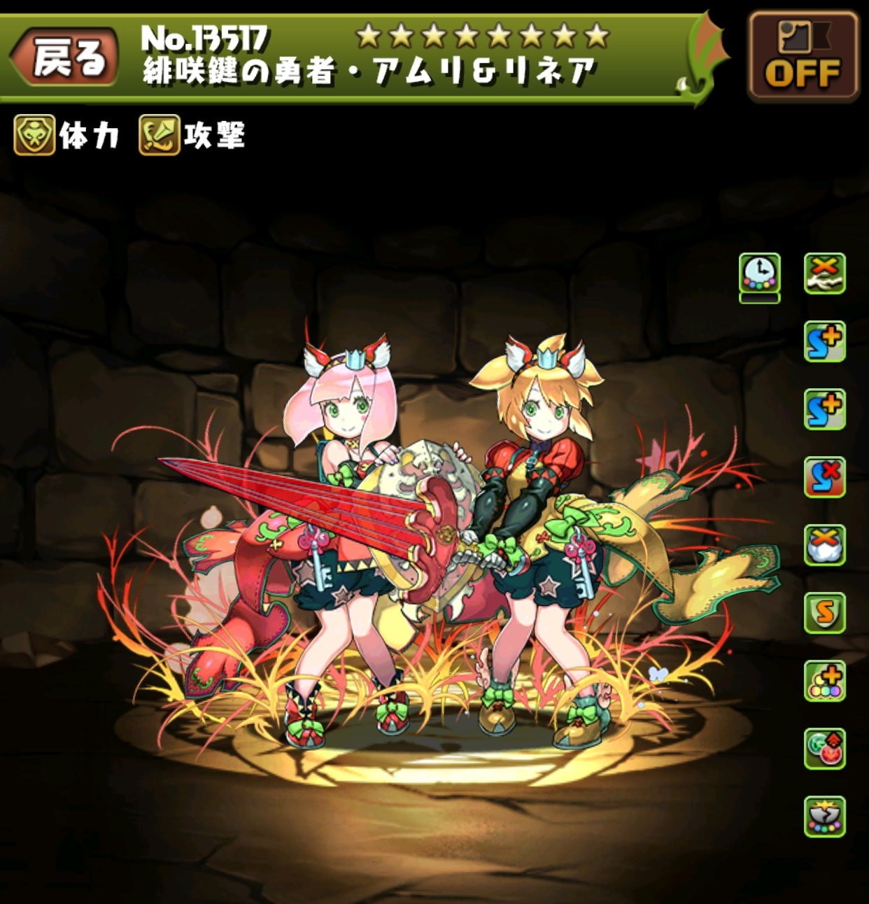 | 2ターンの間、自分と右隣のダメージ上限値が200億。ロックを解除し、盤面を5属性+回復に変化。 |