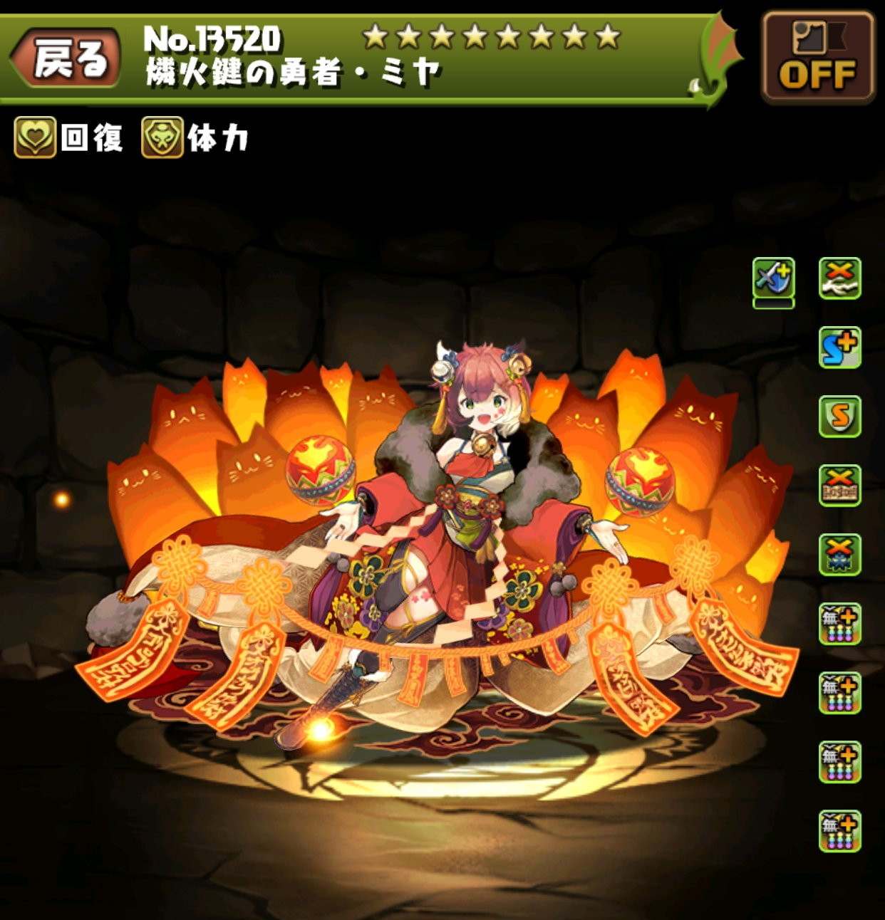 | 6ターンの間、回復力が3倍、火属性のダメージ上限値が140億。1ターンの間、敵全体が火属性に変化。覚醒無効を全回復。 | |