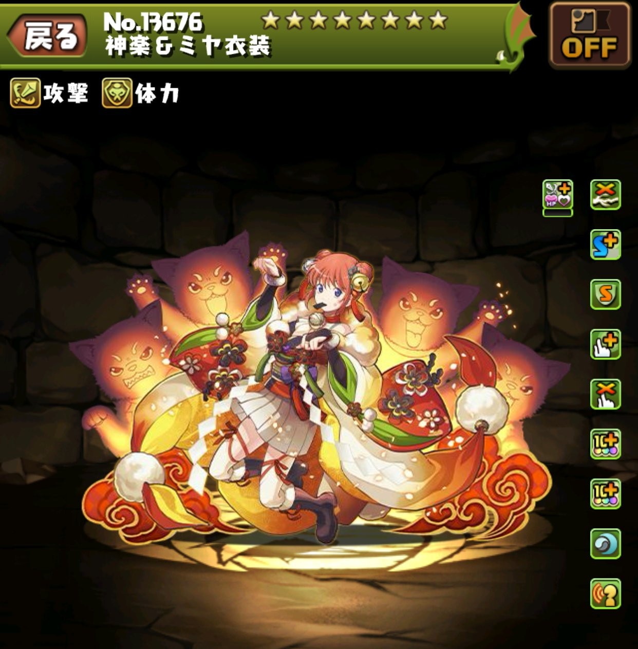 パズドラのミヤ神楽の評価とおすすめ潜在覚醒・超覚醒を記載しています。リーダー/サブ/アシストの評価と使い道、スキル上げの方法、進化素材などのステータス情報も記載しているので、ミヤ神楽を育成する参考にしてください。