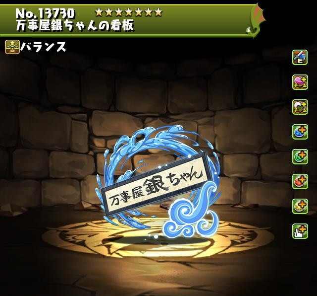 パズドラの万事屋銀ちゃんの看板の評価とおすすめ潜在覚醒を記載しています。リーダー/サブ/アシストの評価と使い道、スキル上げの方法、進化素材などのステータス情報も記載しているので、万事屋銀ちゃんの看板を育成する参考にしてください。