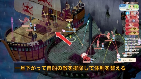 決戦航路は船と船が繋がっているステージで、敵船に大量の敵が配置されています。ステージ開始時は中央に配置されているので、一旦自身の船に下がり敵を排除しつつ体制を整えてから敵船の敵を撃破していきましょう。