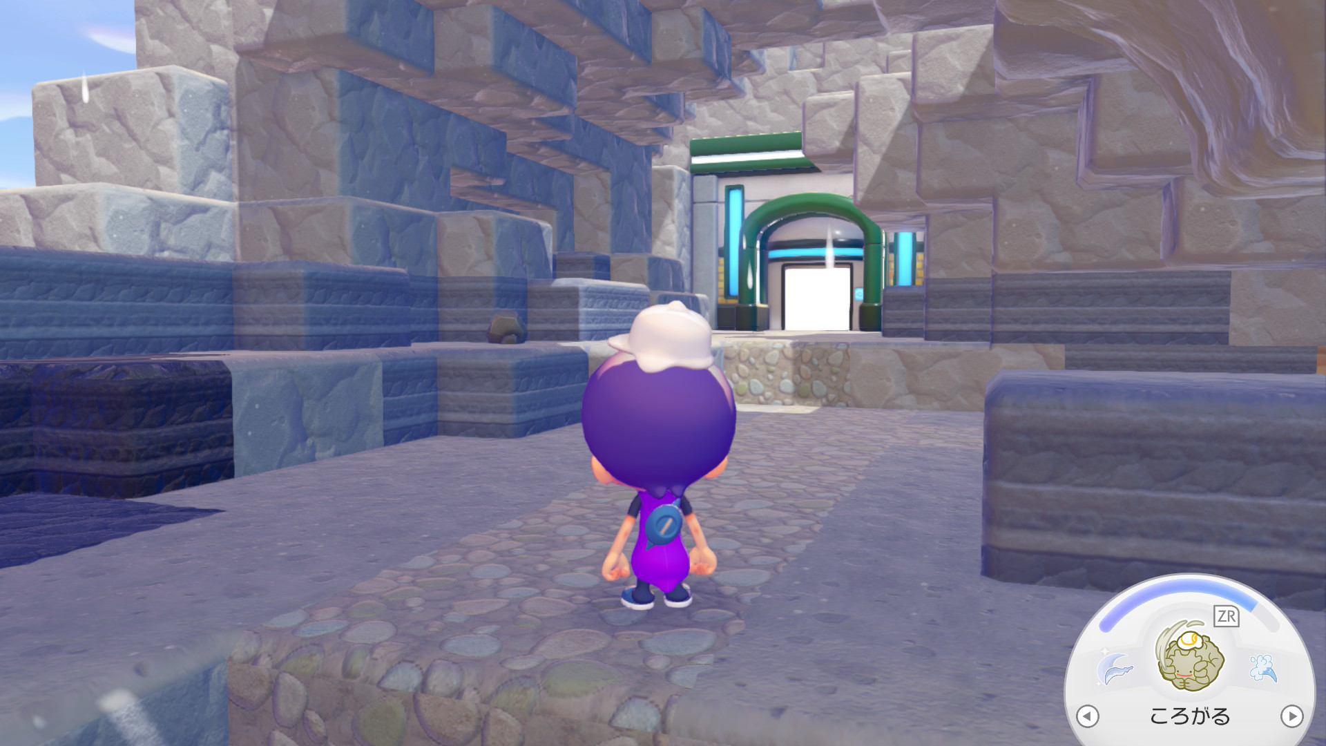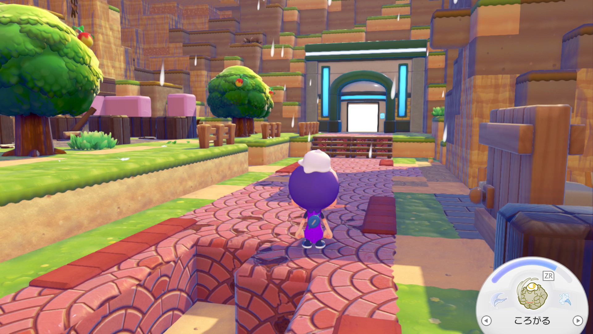 ゴツゴツ山の街ではへんしんわざの「かいりき」と「ころがる」が解放されます。かいりきは岩などの重いオブジェクトを動かせる技で、ころがるは丸まって少し素早く移動できる技です。ころがる中にZRを押すとブロックの破壊も可能です。