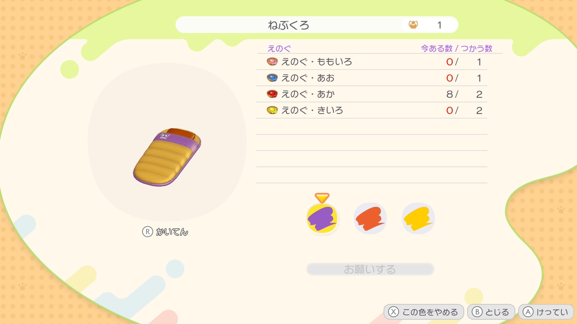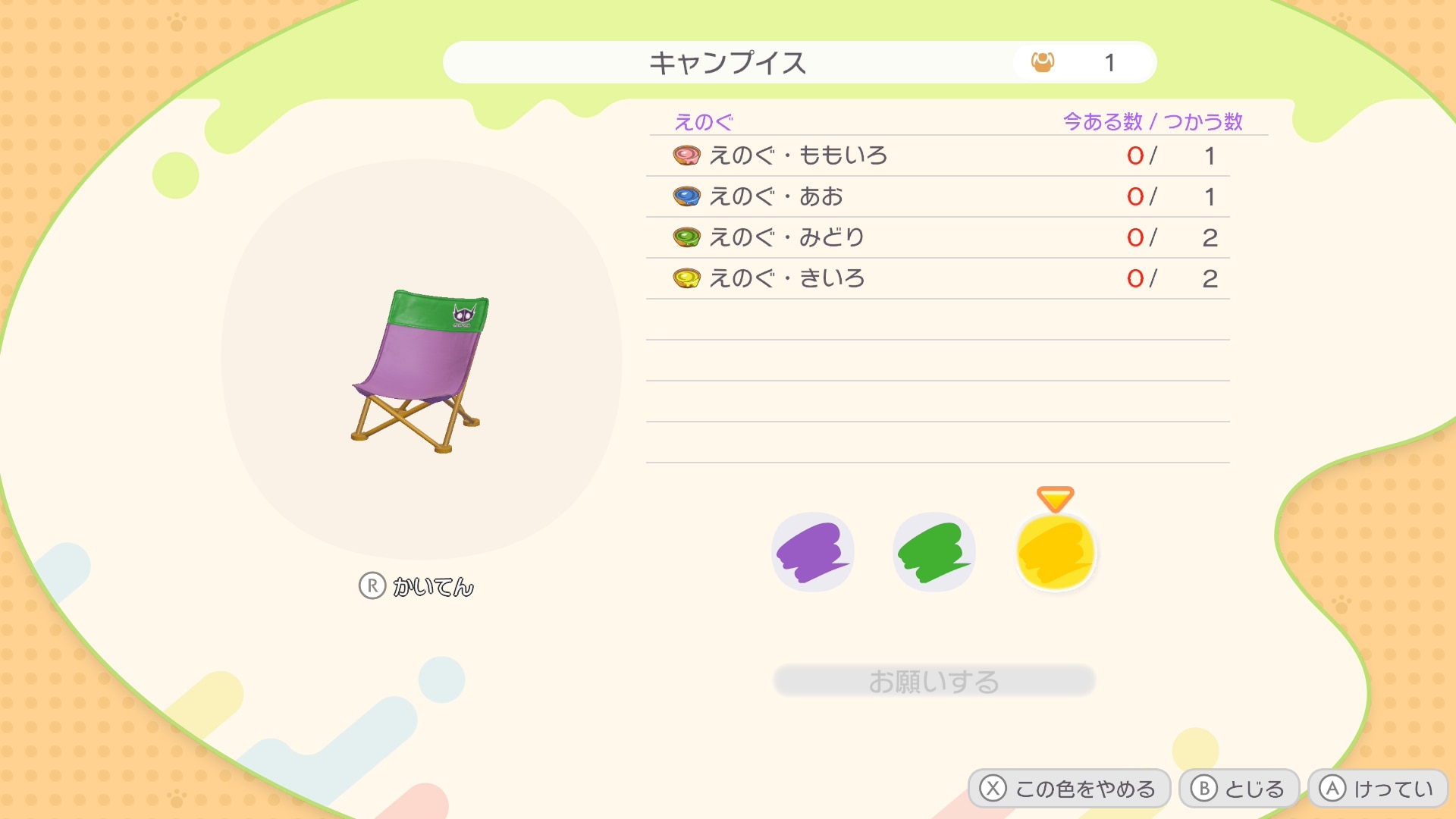 「キャンプイス」と「ねぶくろ」は、「ドーブルせんせい」と「いろふうせん」で色を変更できます。いろふうせんは単色にしか色を変更できないため、3パーツ異なる色で変更したい場合はドーブルせんせいに依頼しましょう。