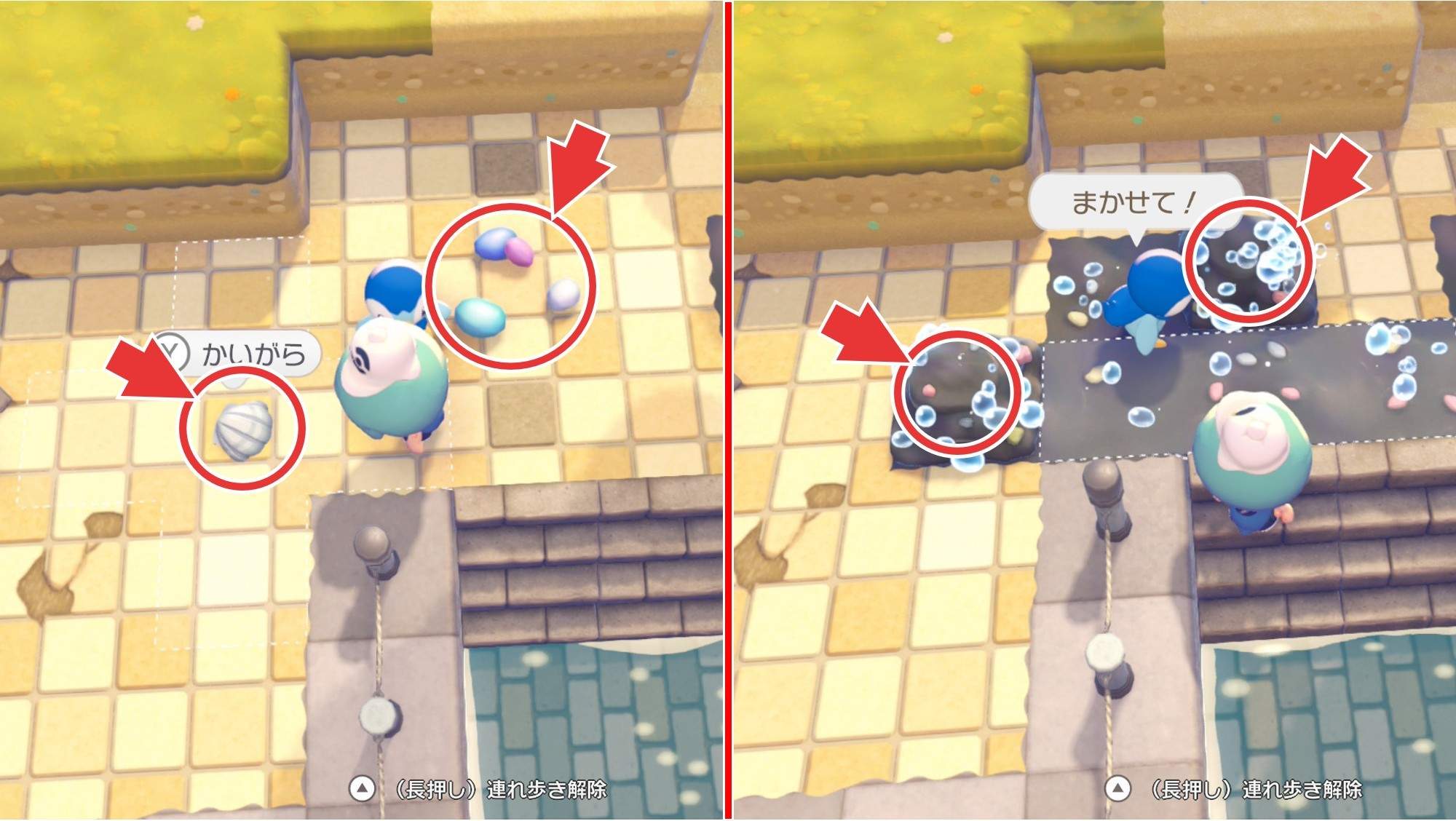かいがらは、ドロを洗い流すと確率で入手可能です。得意なこと「うるおす」ができるポケモンをドロの元へ連れて行ってみずでっぽうをすると、ドロを洗い流せます。