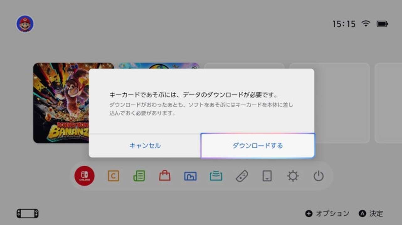 キーカードを差し込んだら、ホーム画面にダウンロードの案内が表示されます。ダウンロードを選択して、インターネットを経由して本体かmircoSDEXカードにゲームデータをダウンロードしましょう。