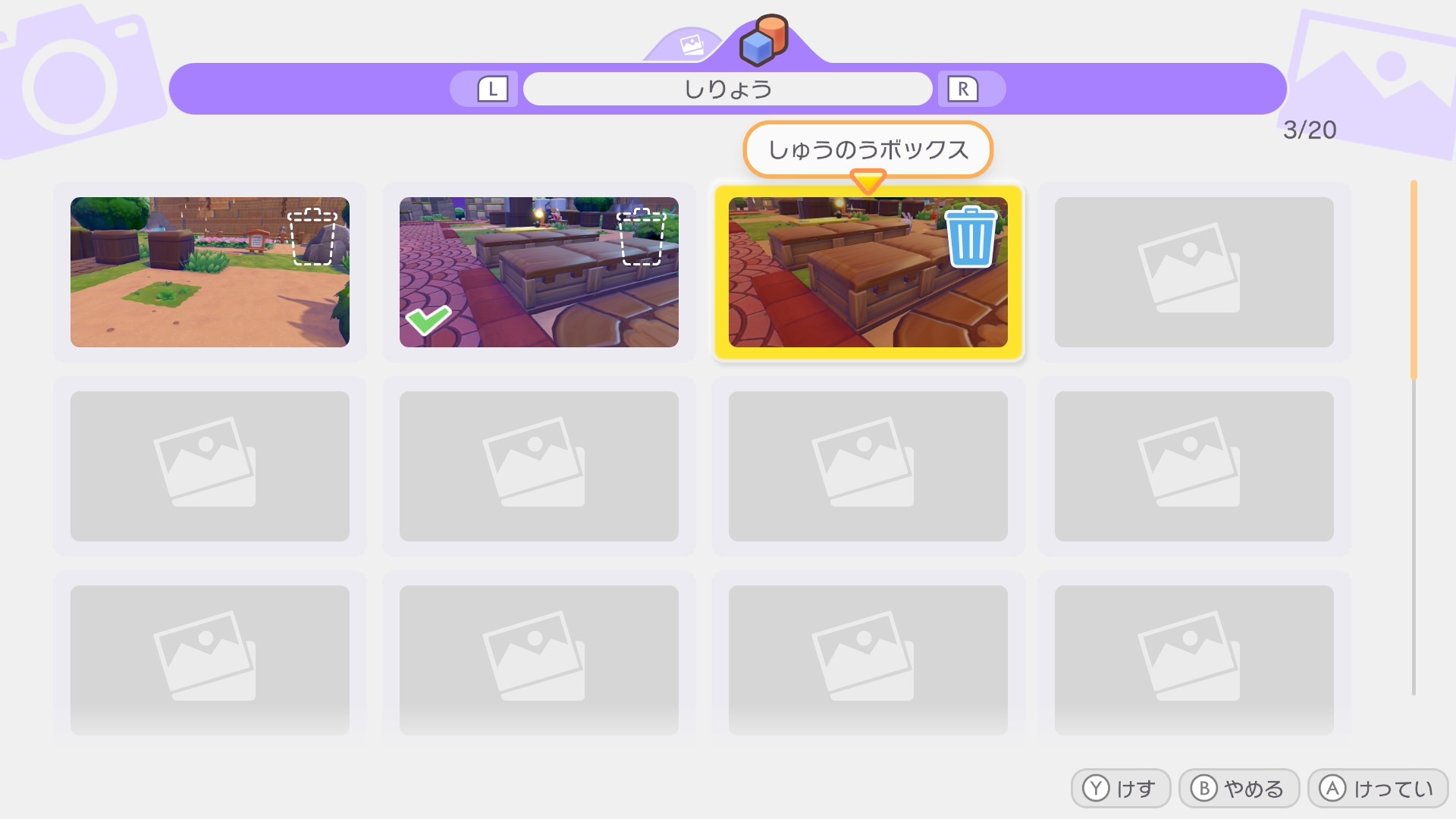 | 3 | 拡大する「R」ボタンで項目を「しりょう」に変え、消したい写真を選んで消す |