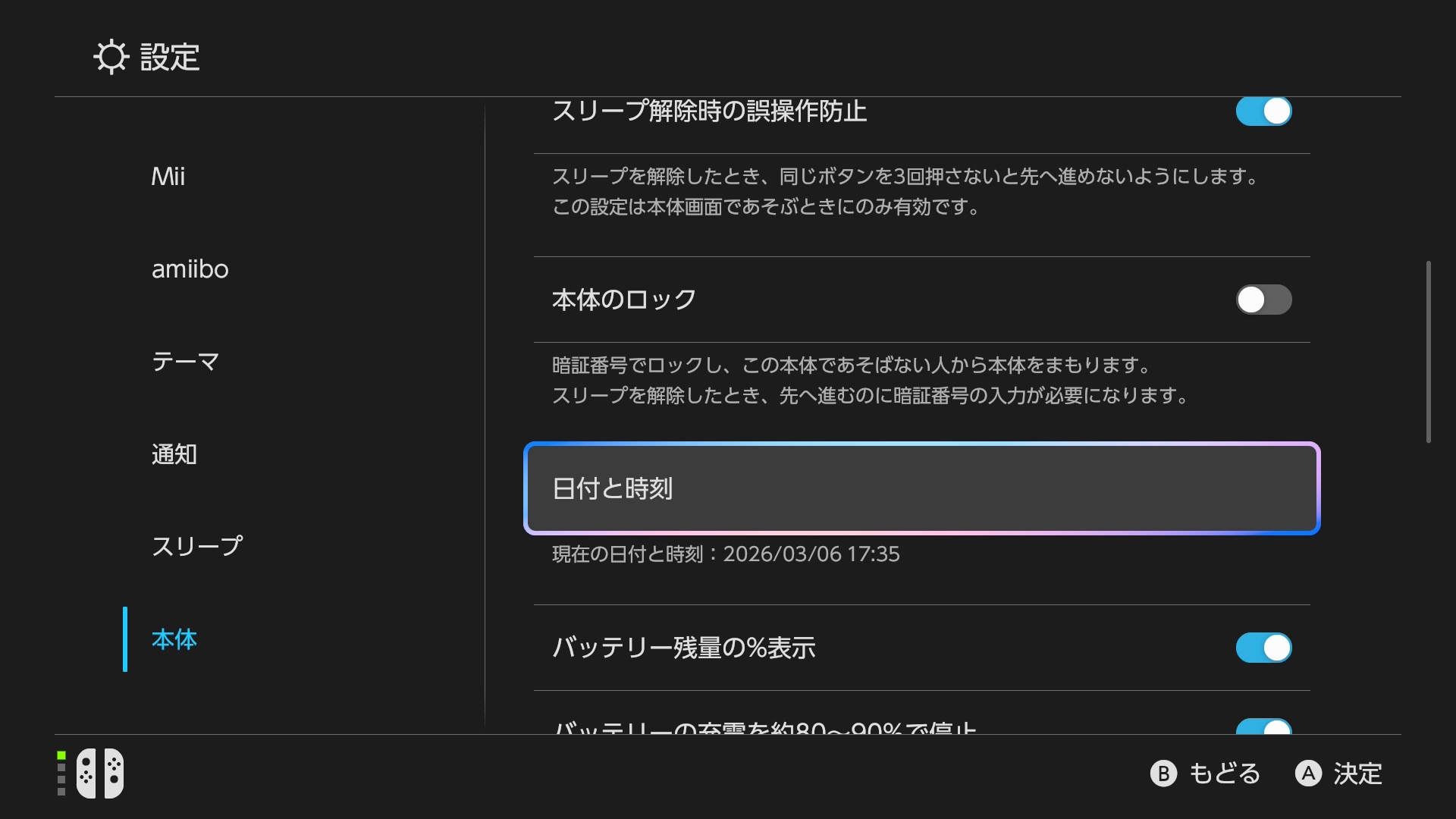 拡大する設定項目内の「本体」→「日付と時刻」を選択3