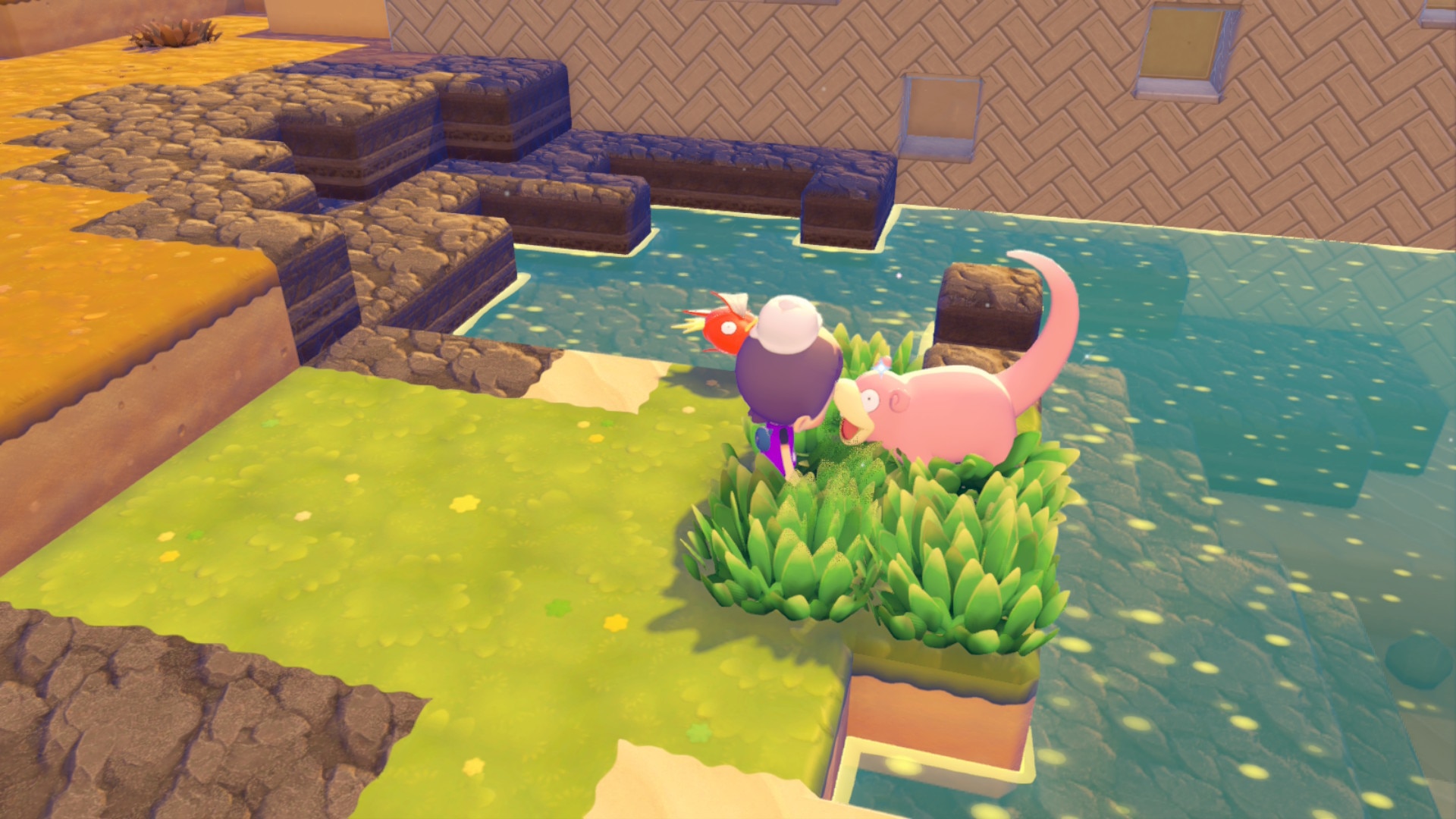 波打ちぎわの草むらでヤドンが出現したら話しかけましょう。ヤドンに話しかけると次のたのみごと「道をキレイにしよう!」に派生します。