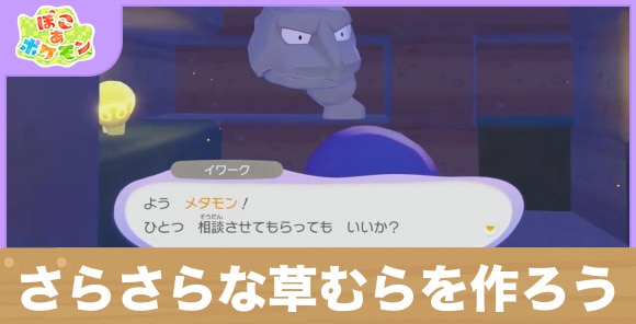 さらさらな草むらを作ろうは、イワークと会話をすると発生します。チャレンジ内容は、 生息地「さらさらな草むら」を作って、イワークに住んでもらうことでクリアです。