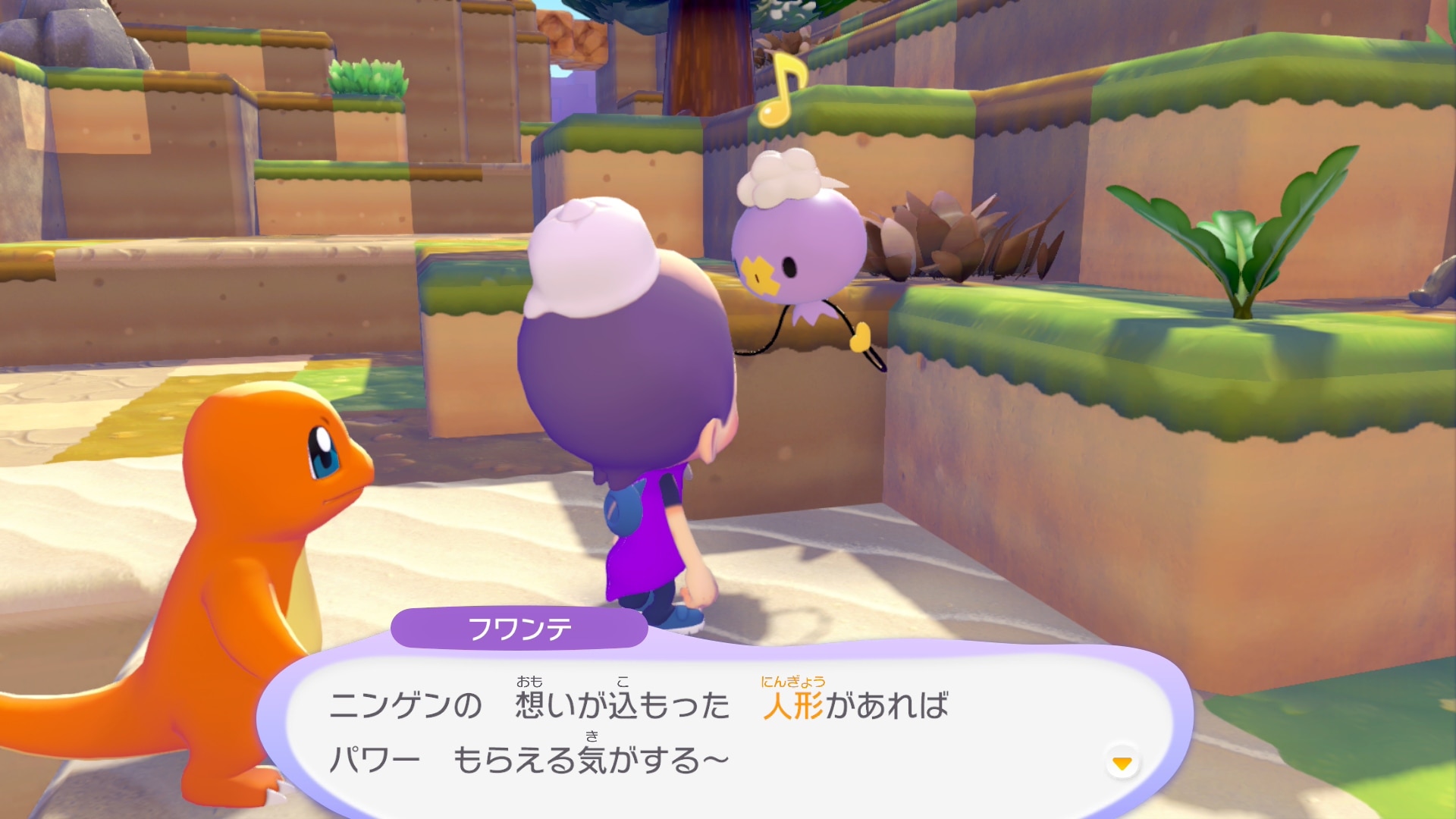 に乗って・たきび×3 にんぎょうを探そうを始めるためには、まずフワンテのすみかを作りましょう。たきび3つを設置してヒトカゲに火をつけてもらえば完成です。すみかを作った後にフワンテに話しかけましょう。