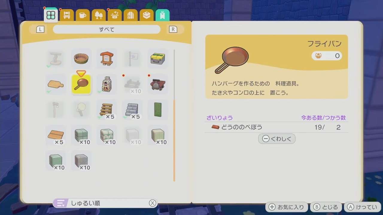 生息地 素材 フライパン ・どうののべぼう×2 どうののべぼうを消費して、フライパンを作りましょう。