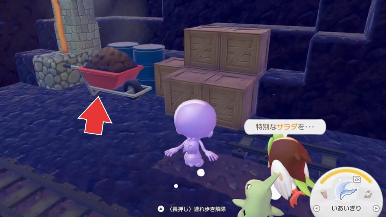 ておしぐるまは、ゴツゴツやまの街で拾えます。強化したいあいぎりで金網を切った先にあるので、回収して生息地づくりに利用しましょう。