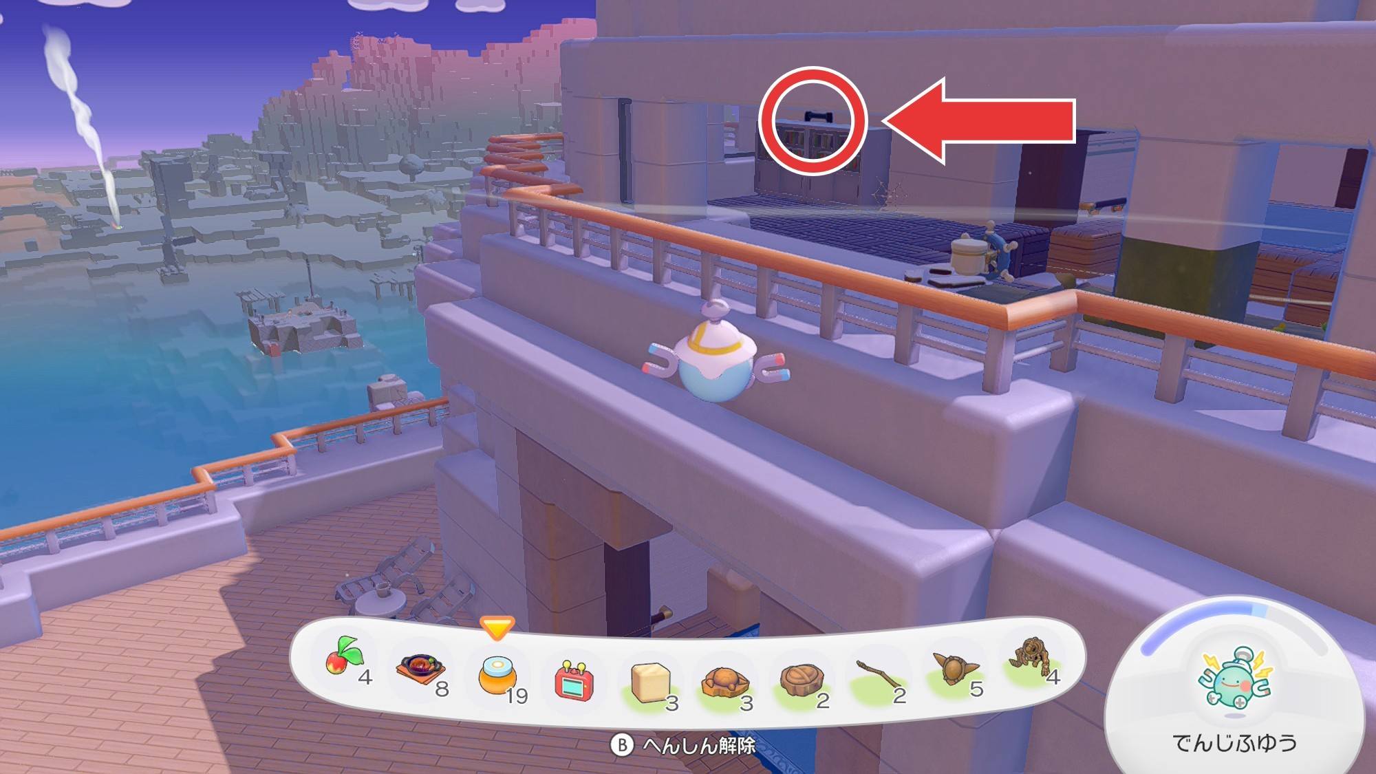 ミミッキュの生息地に必要な「ピカチュウソファ」は、ドンヨリうみべの街の南にある大型客船の中にあります。大型客船に着いたら、船の先端にある運転席に入り、運転席近くのハシゴから奥に進むと入手できます。