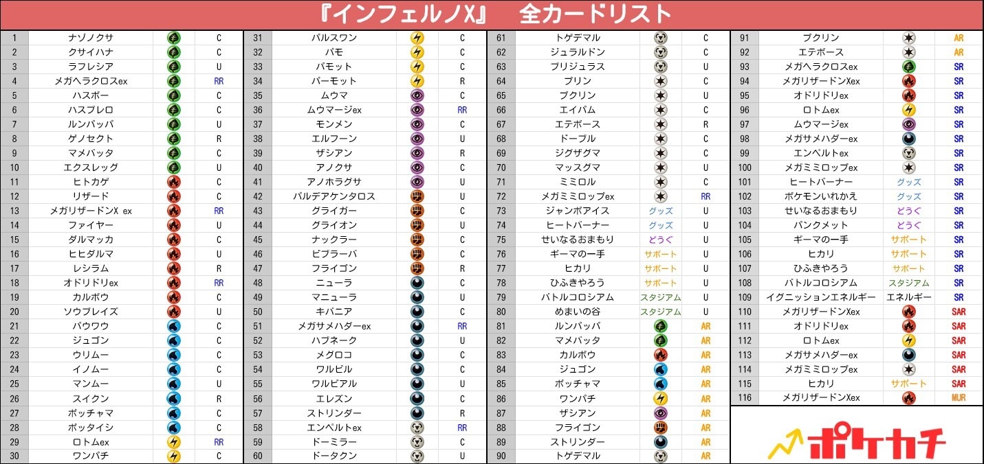 ポケカ(ポケモンカード)のインフェルノX収録カードリストを紹介。SARやMUR、SR、RRなどレアリティごとの一覧や最新収録カードについても記載しています。拡張パックインフェルノXの全収録カードをみる参考にしてください。