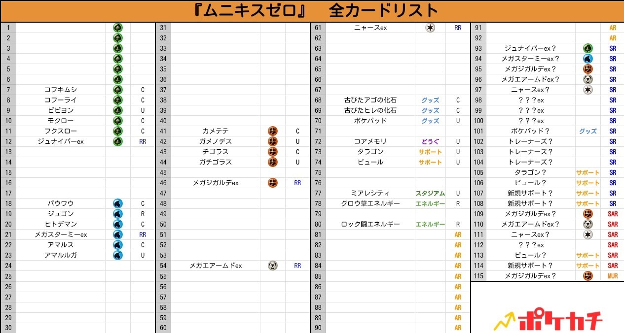 ポケカ(ポケモンカード)のムニキスゼロに収録されている全カードリスト一覧を紹介。MURやSAR、SRなどレアリティごとの一覧や新規収録カードについても記載しています。ムニキスゼロの全収録カードを見る参考にしてください。
