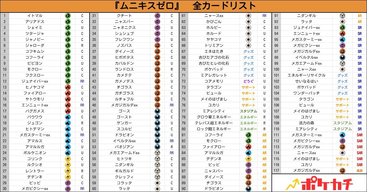 ポケカ(ポケモンカード)のムニキスゼロ収録カードリストを紹介。SARやMUR、SR、RRなどレアリティごとの一覧や最新収録カードについても記載しています。拡張パックムニキスゼロの全収録カードを見る参考にしてください。