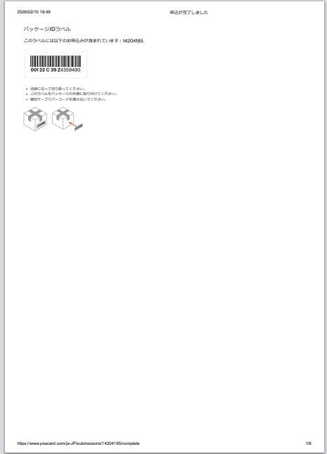 【必須】パッケージIDラベル ・申込時に発行される ・ステップ4で印刷 └印刷機が必要。コンビニ等でも可能 ・バーコードを切り取って段ボールに貼付 ・1注文につき1枚 |