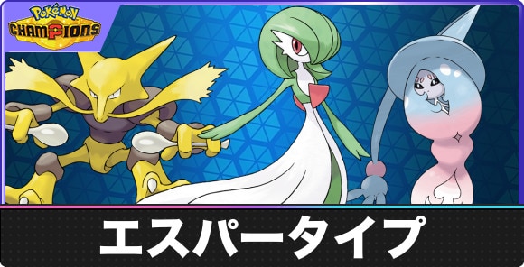 ポケモンチャンピオンズのエスパータイプのポケモンを一覧形式でご紹介。エスパータイプのポケモンの特性や種族値を記載しているので、ポケチャンでエスパーポケモンを探したいときにご覧ください。