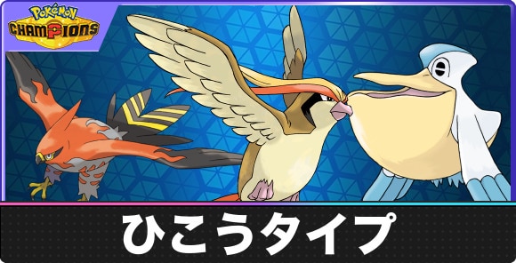 ポケモンチャンピオンズのひこうタイプのポケモンを一覧形式でご紹介。飛行タイプのポケモンの特性や種族値を記載しているので、ポケチャンでひこうポケモンを探したいときにご覧ください。