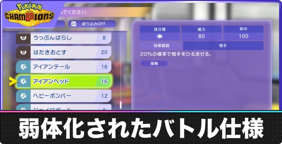 ポケモンチャンピオンズでは、アイアンヘッドの追加効果で怯む確率が30%→20%に弱体化しました。なお、同様に怯みが強力な「いわなだれ」の怯み確率は30%から弱体化されてません。