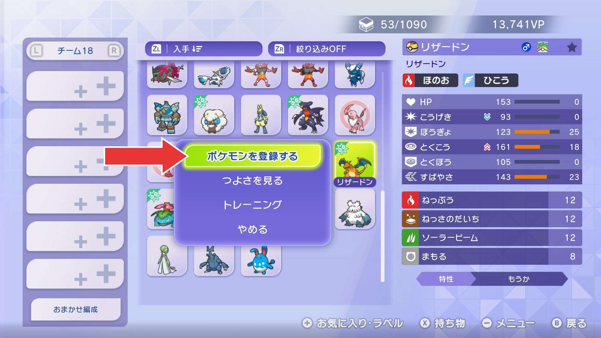 | 1 | 拡大するボックスにいるポケモンから「ポケモンを登録する」を選択 |