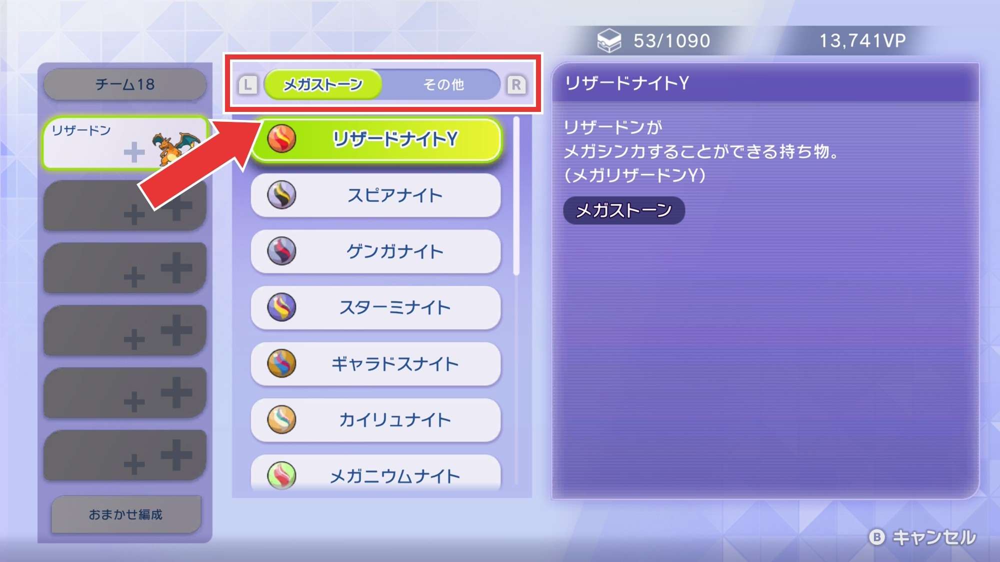 | 3 | 拡大するLとRで「メガストーン」のタブに切り替える |