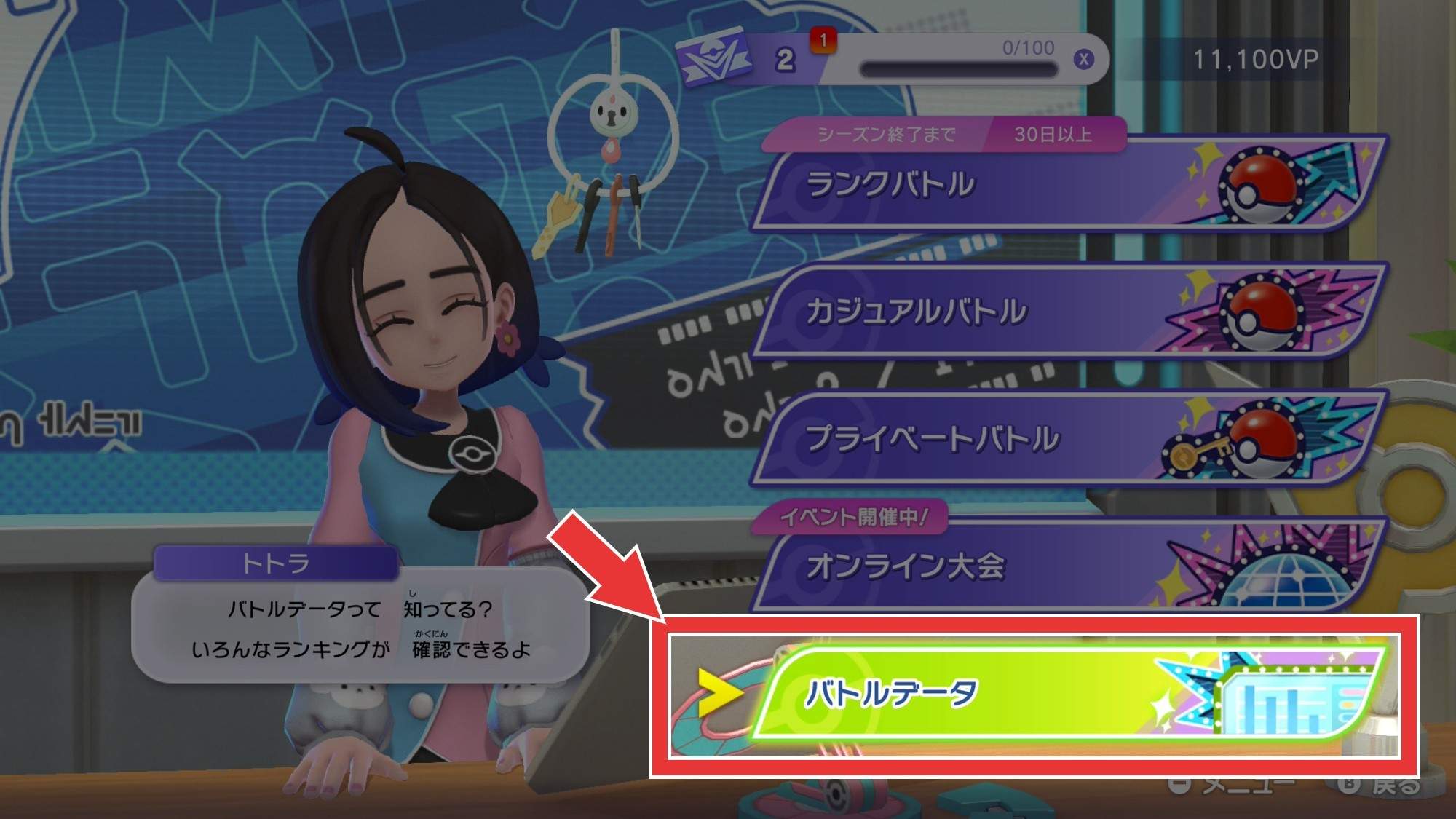 ポケモンチャンピオンズのランクマ使用率は、メニュー画面のバトルからバトルデータを選択して、ランクバトル→Rボタンでポケモンを選ぶことで確認できます。
