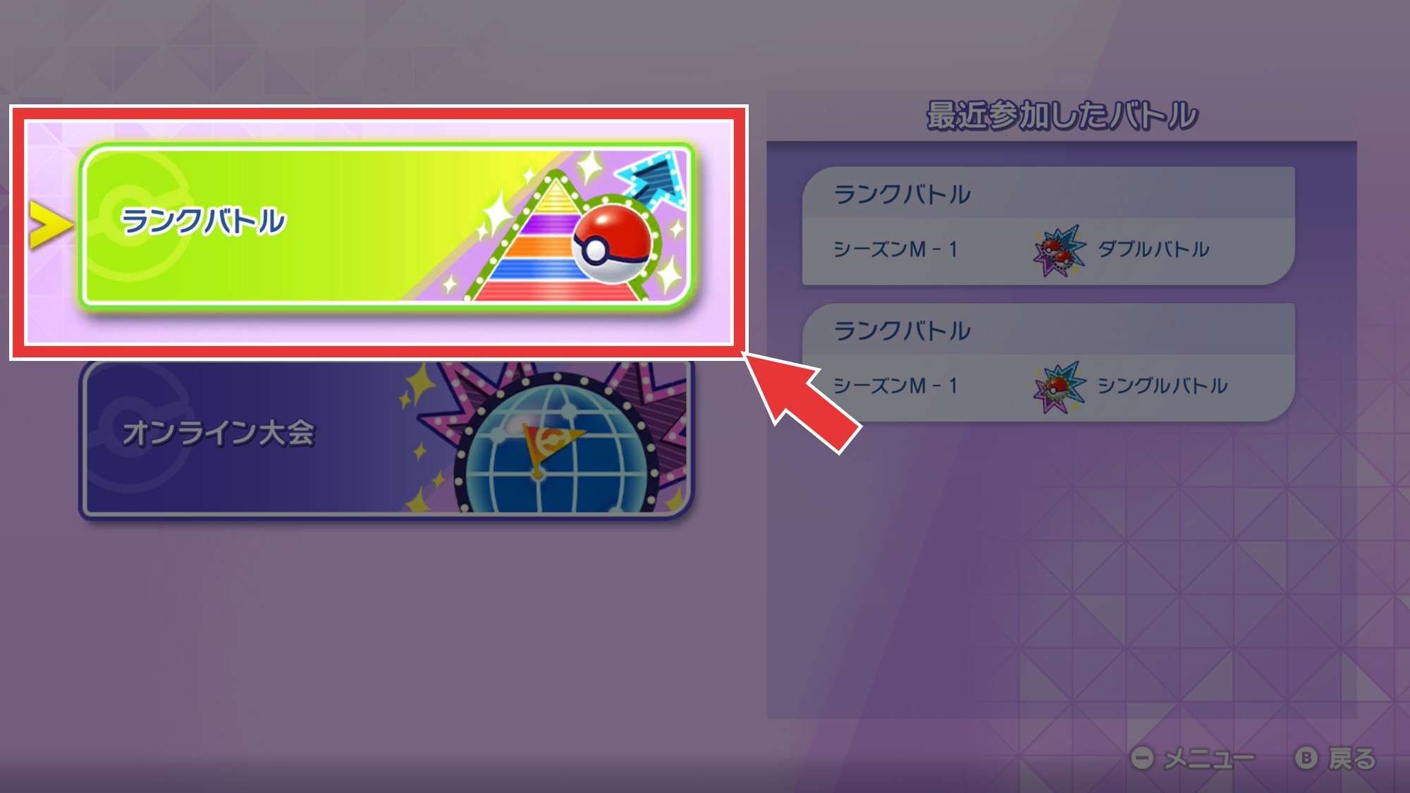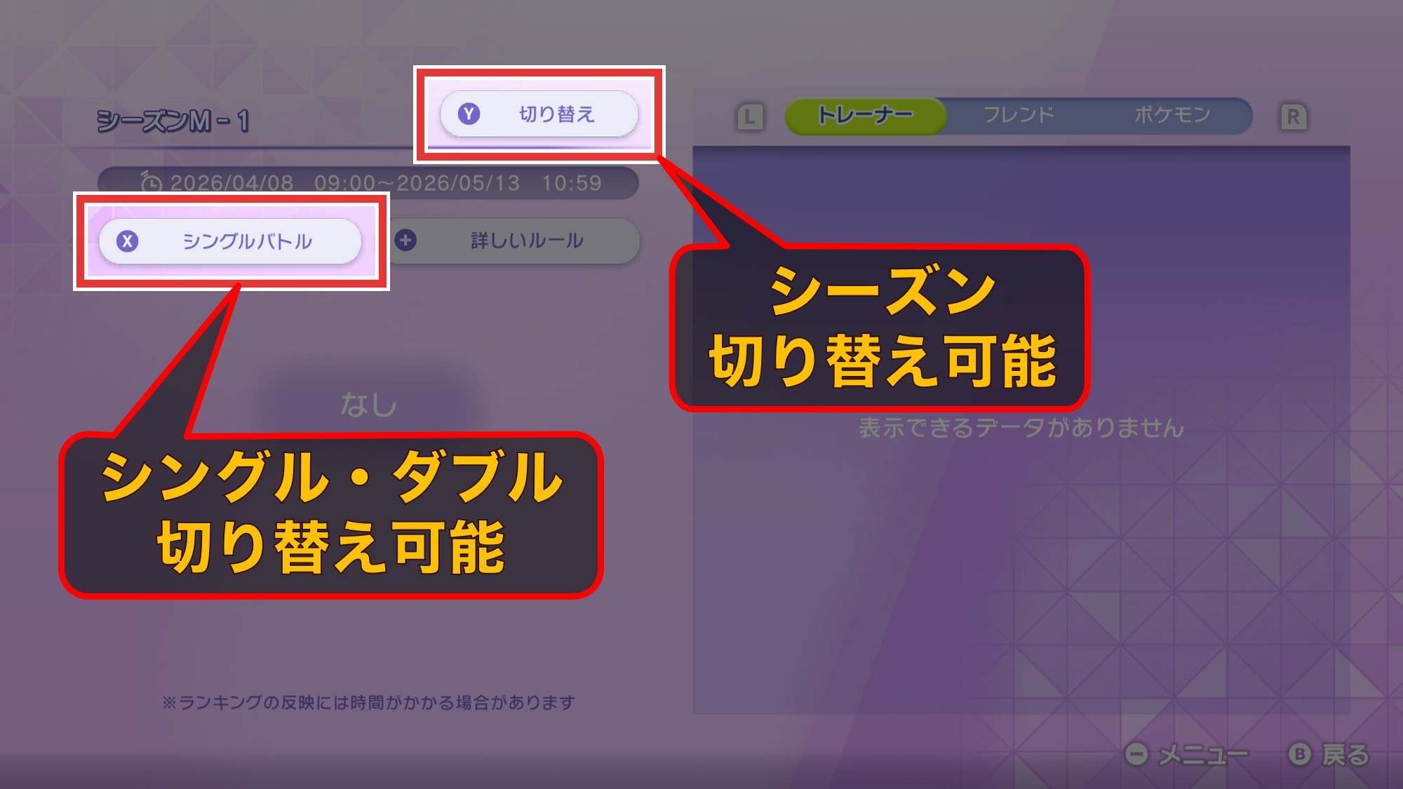 | 4 | 拡大する確認できる画面に到達※Xボタンでシングル・ダブルバトルの切り替えが可能 ※Yボタンでシーズンの切り替えが可能 |