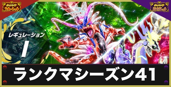 ポケモンSV(スカーレットバイオレット)のランクマッチシーズン41のルールを記載しています。開催期間やレギュレーションIルールでの環境考察、ランクマッチの報酬やシーズン41以降の情報などを掲載しているので、シーズン41の対策をする時の参考にしてください。