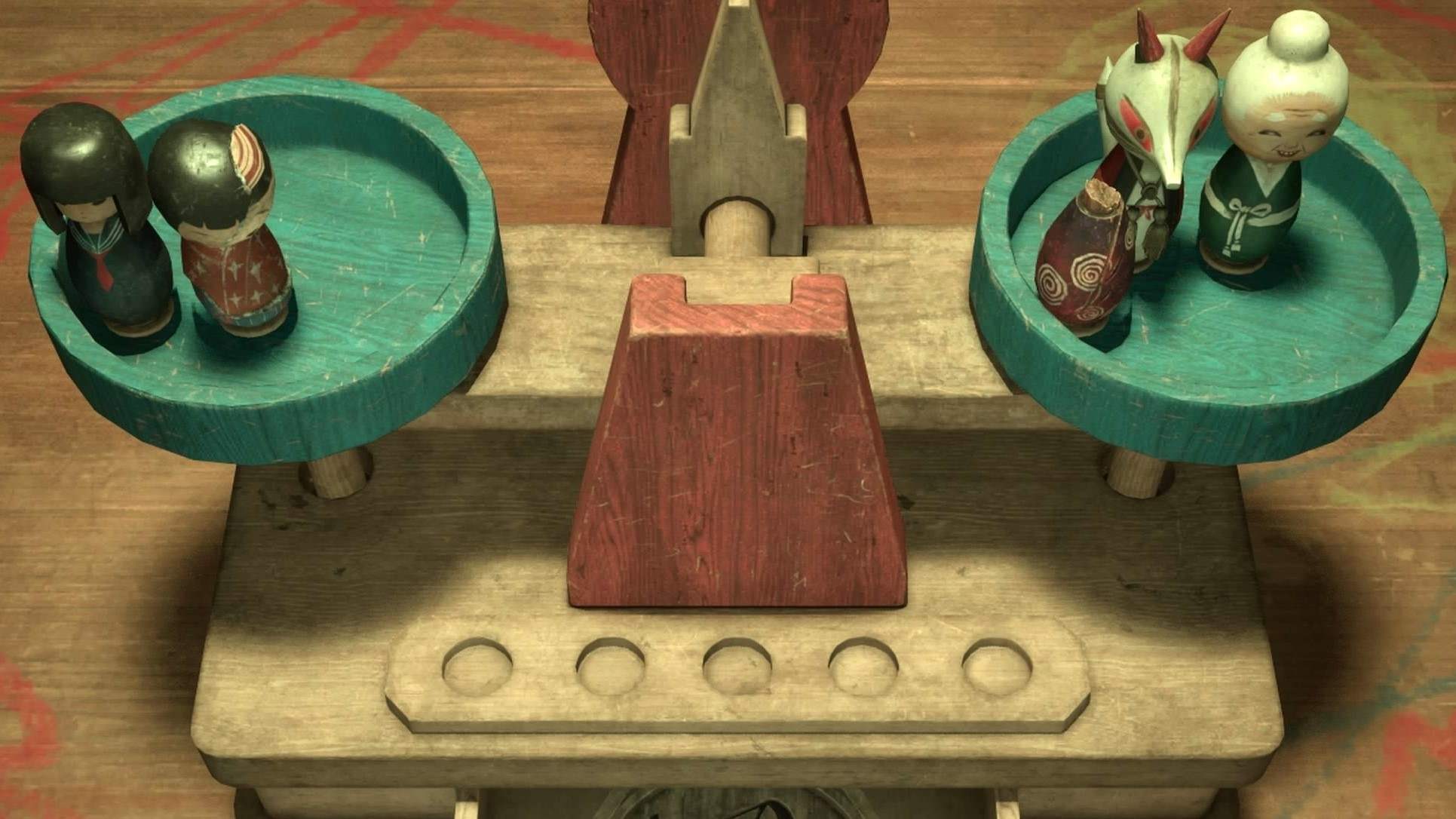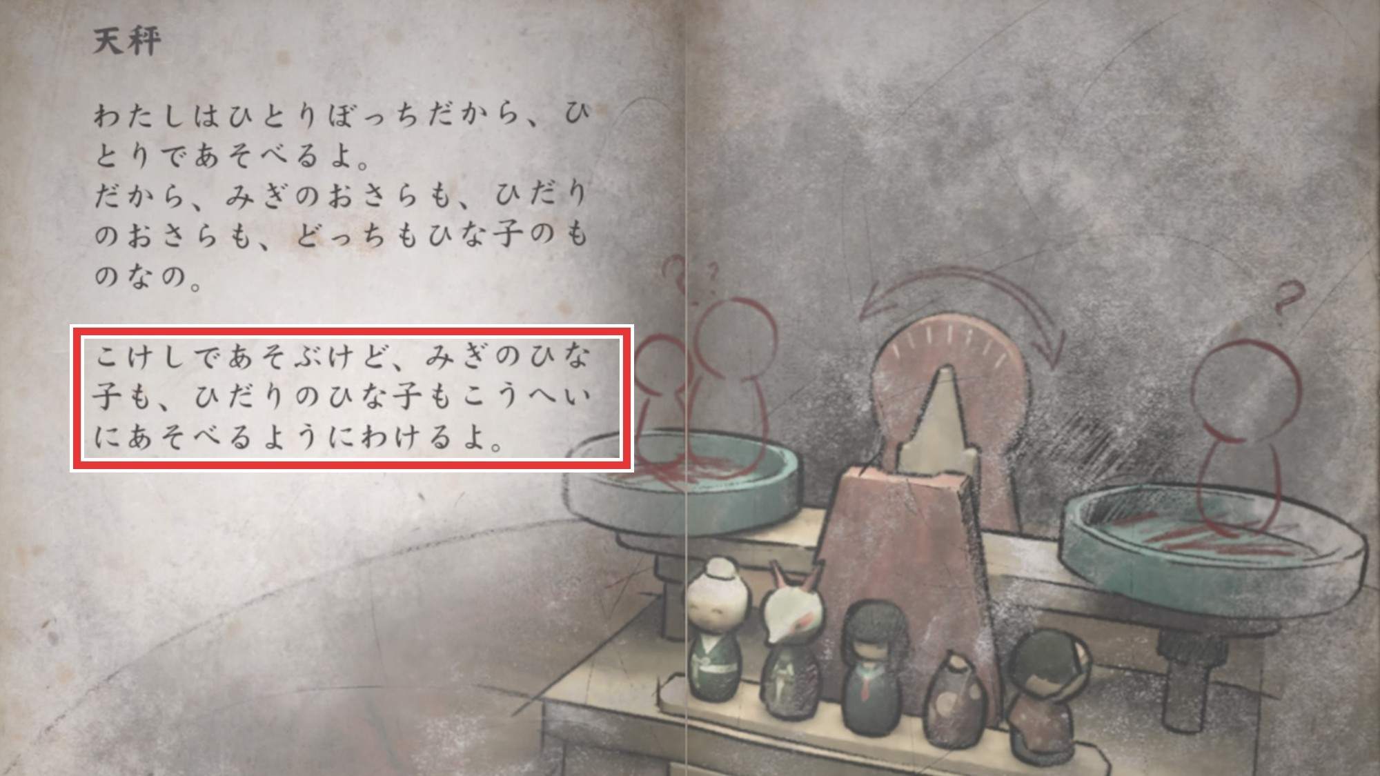 天秤の謎解きのヒントの内容は、難易度とエンディングを通して一緒です。「こうへいにあそべるようにわける」と記載があるため、左右でこけしの重さが均等になるように置きましょう。