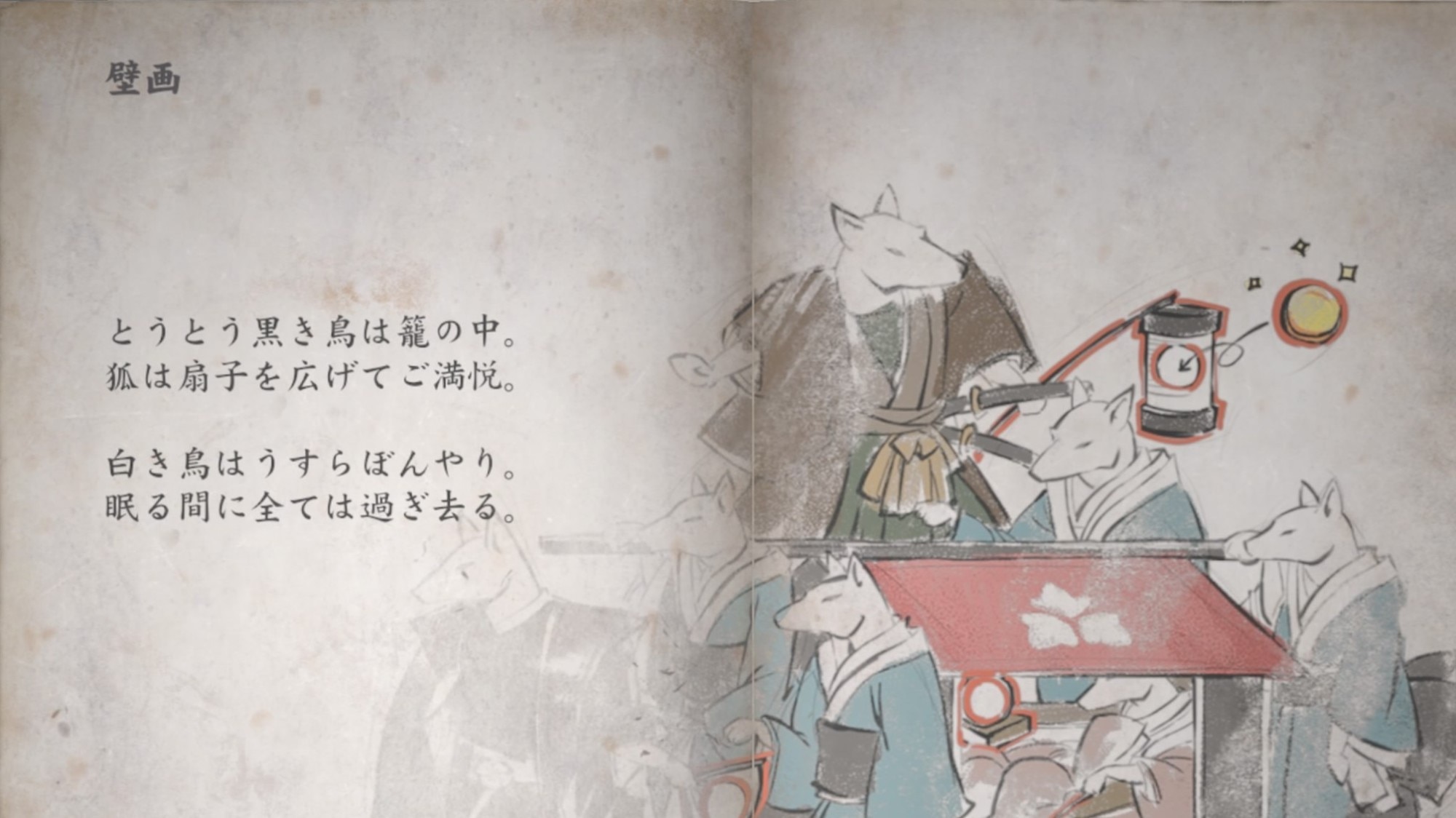 ヒント | とうとう黒き鳥は籠の中。 狐は扇子を広げてご満悦。 白き鳥はうすらぼんやり。 眠る間に全ては過ぎ去る。 |