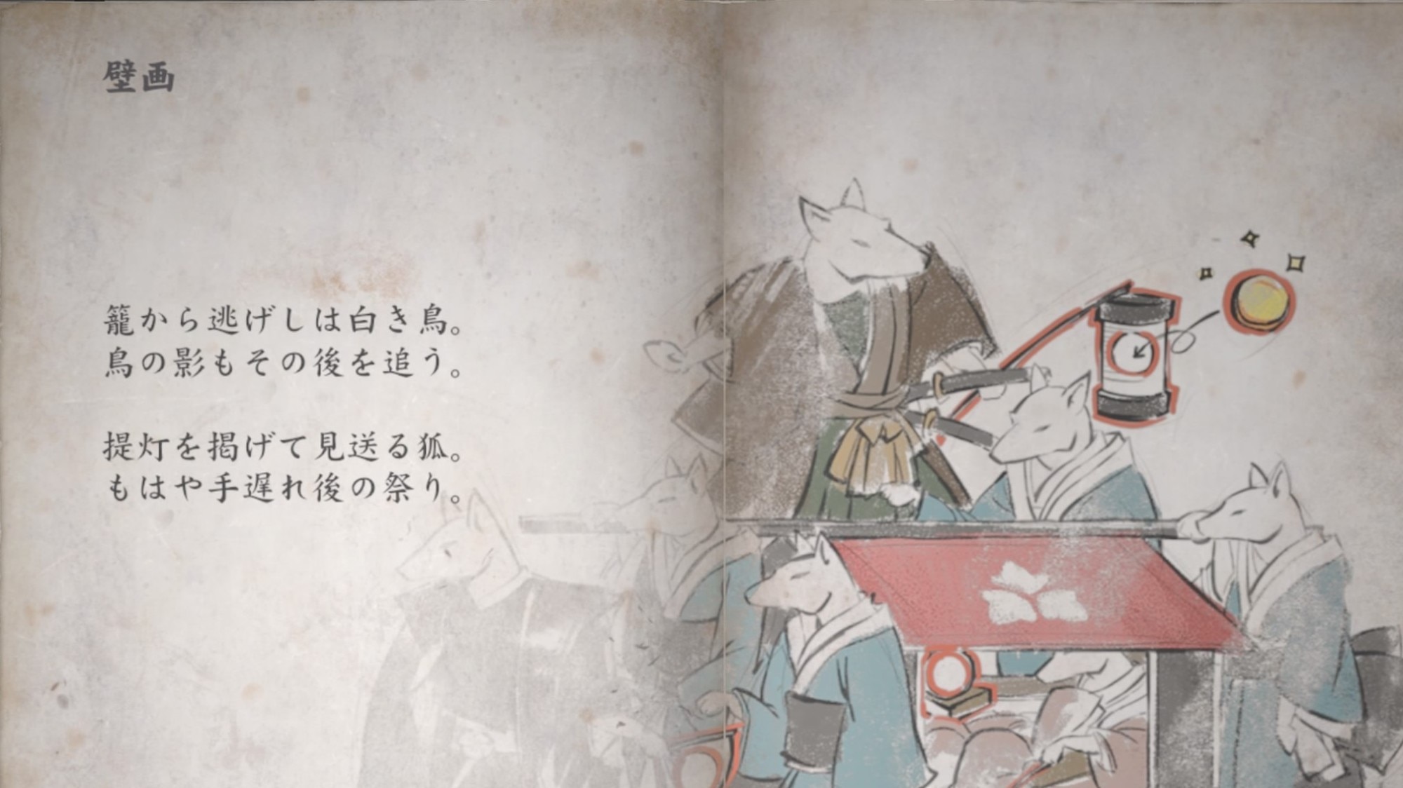 ヒント | 籠から逃げしは白き鳥。 鳥の影もその後を追う。 提灯を掲げて見送る狐。 もはや手遅れ後の祭り。 |