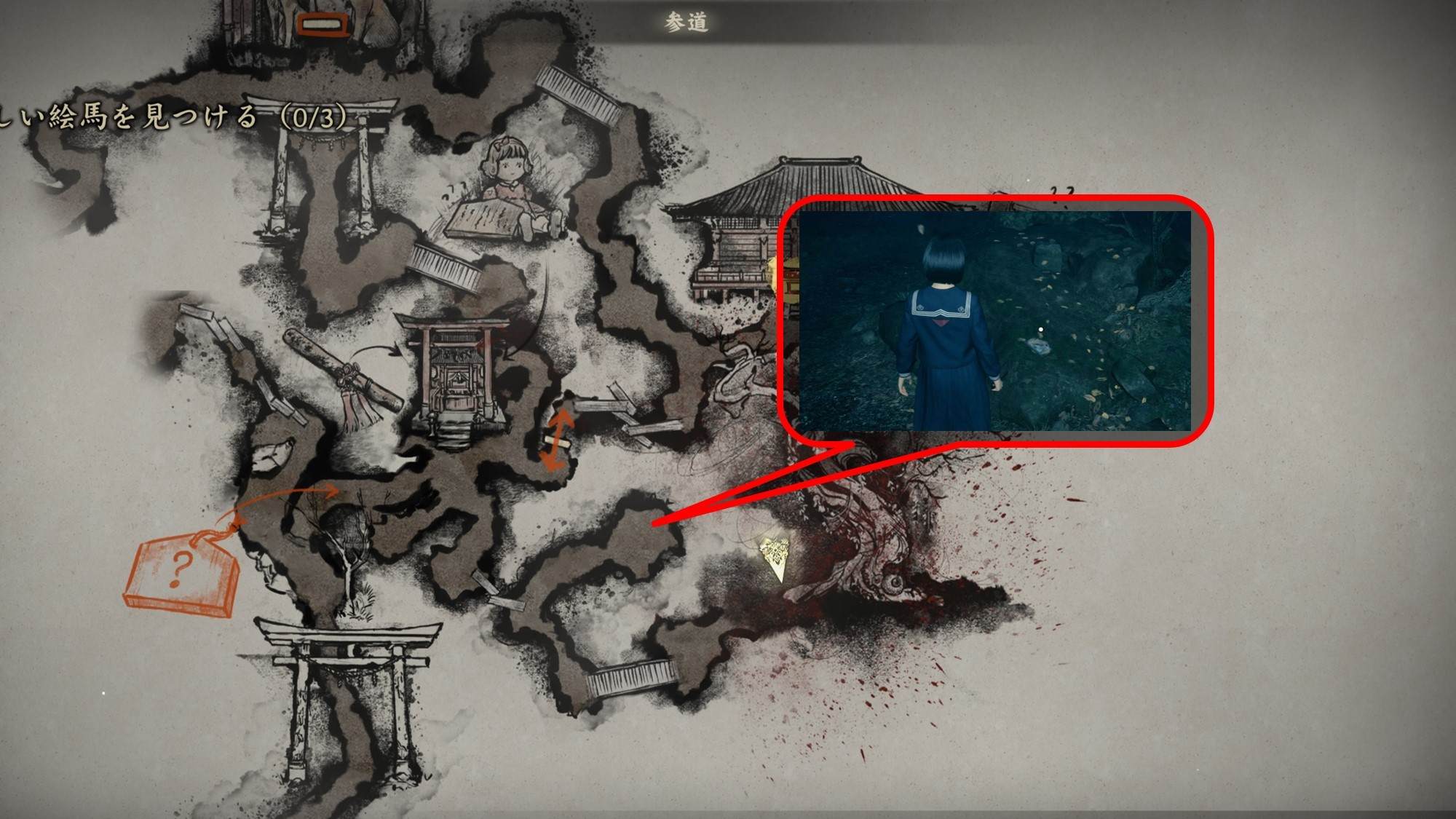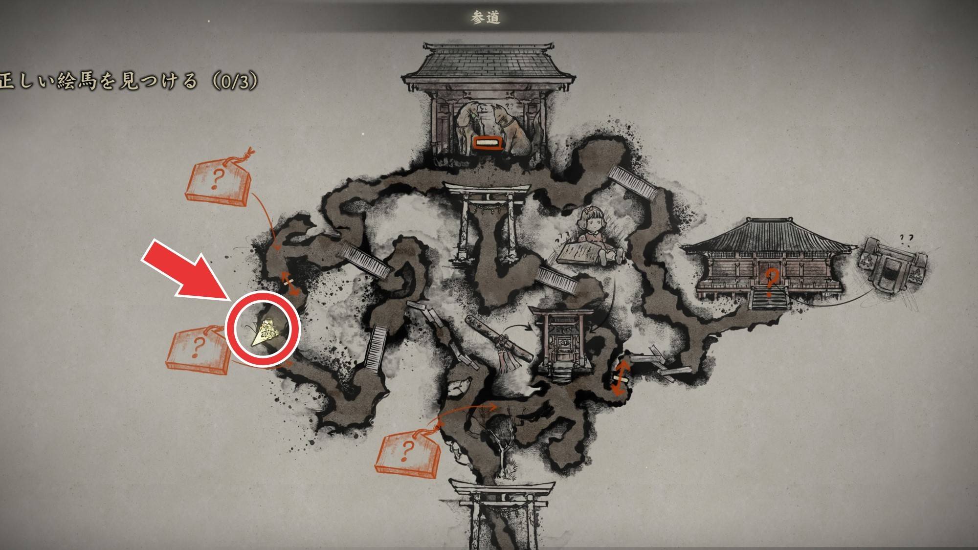 参道は2周目の追加要素として、マップの南東で祈願絵馬とお守り【モグラ】が入手できます。入手できるタイミングは、絵馬のヒント入手後です。