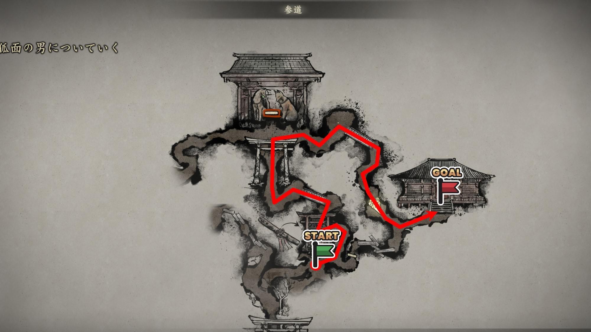 建物から出たら、狐面の男についていきましょう。鳥居で一本道となっており、横道に逸れようとしても正しい道に戻されるため、迷う心配はありません。