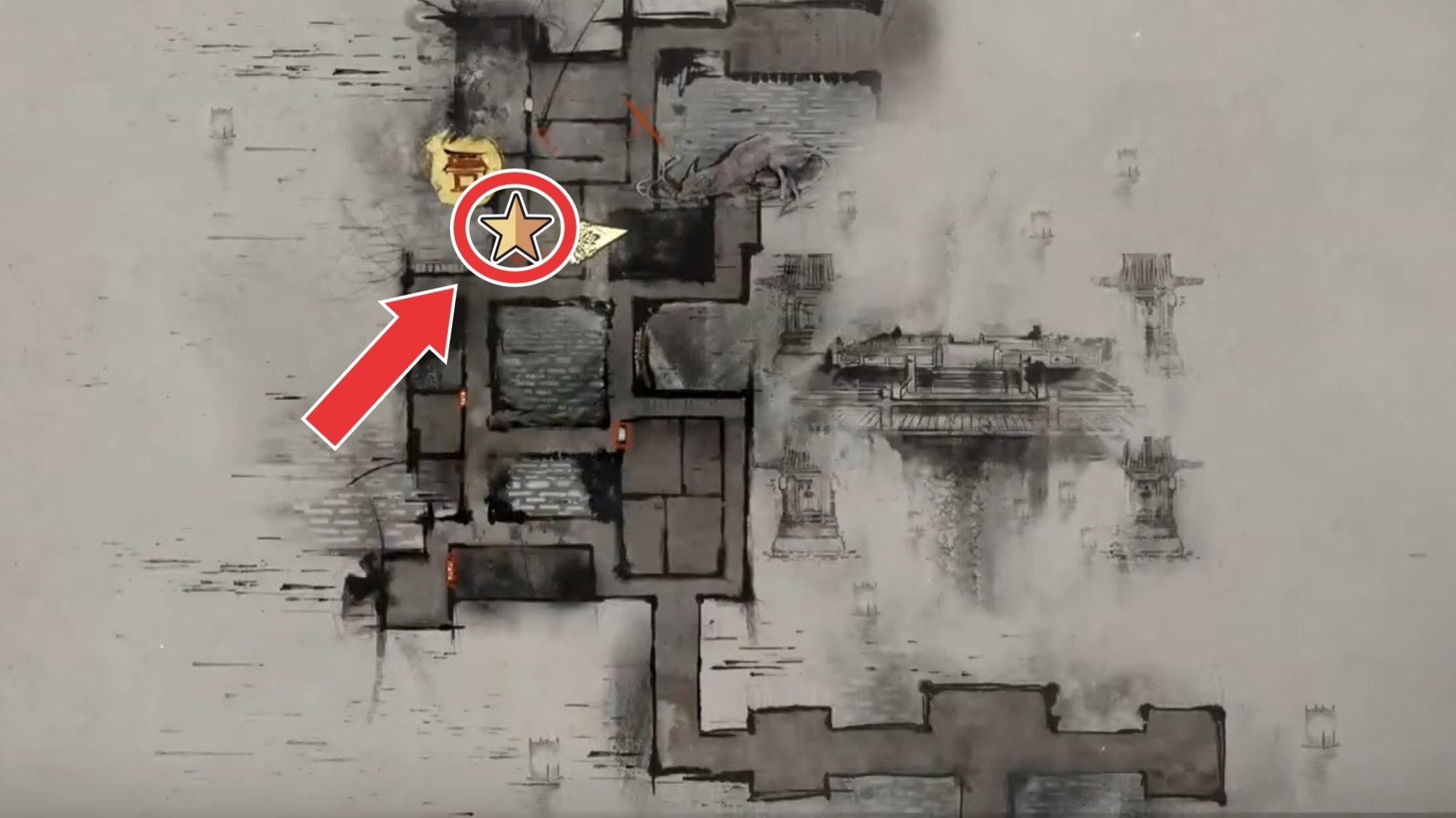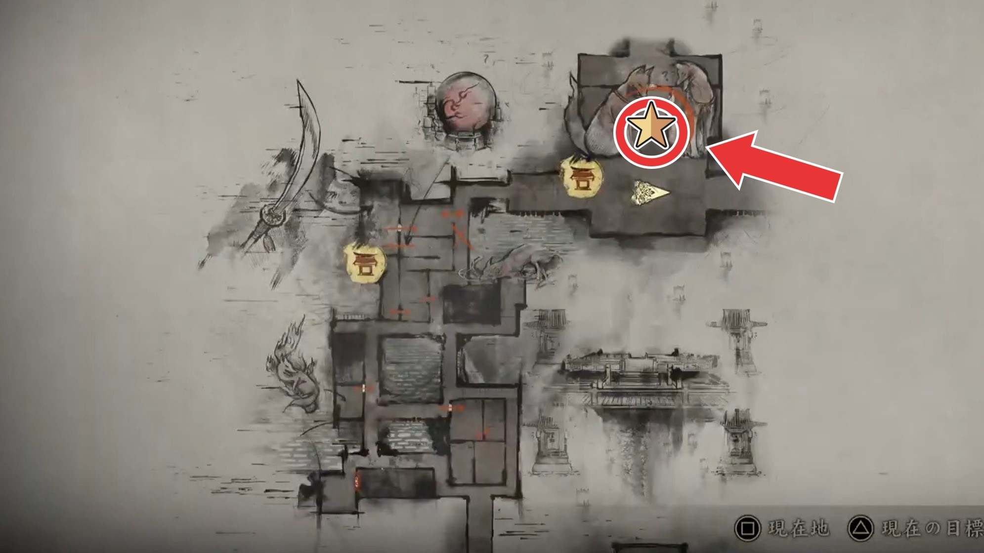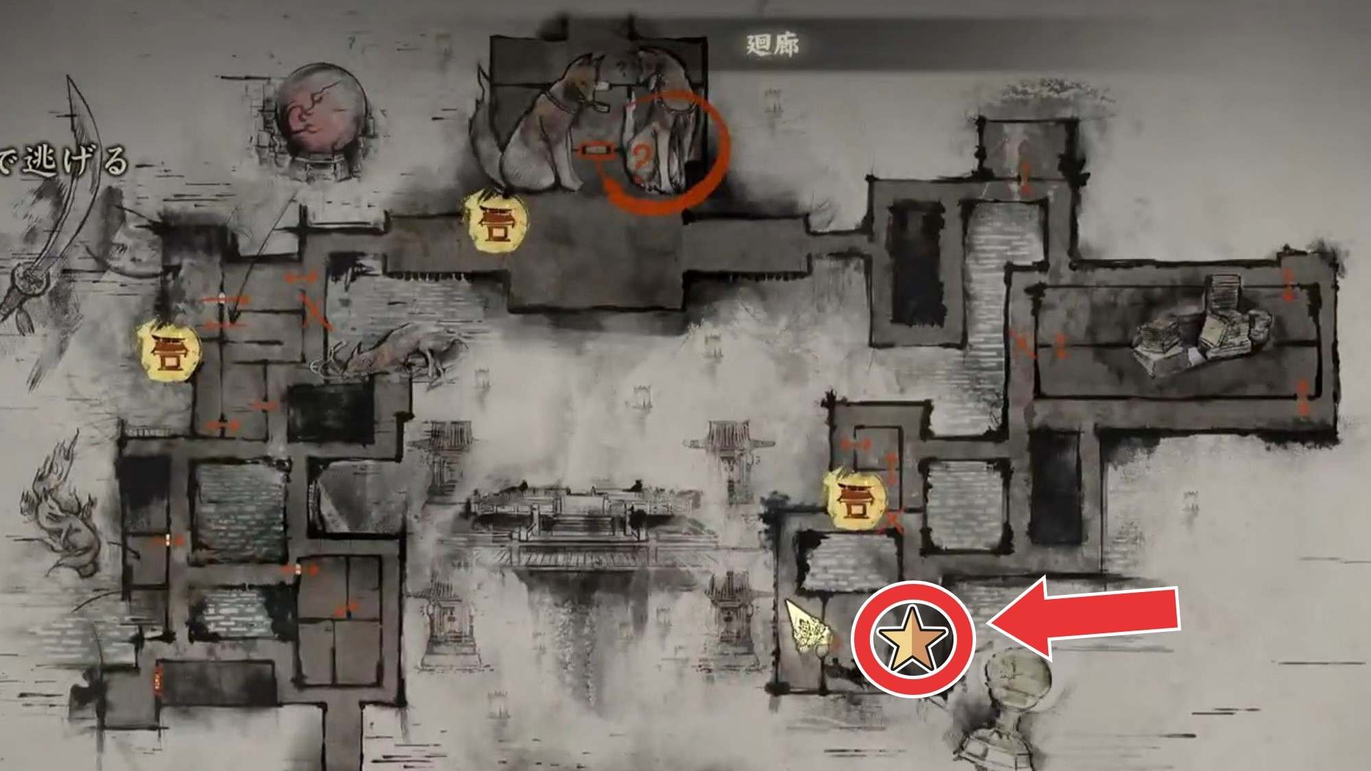 廻廊の祈願絵馬は、マップ左下の扉の近くにあります。扉の右にある箱の上に、祈願絵馬が落ちています。