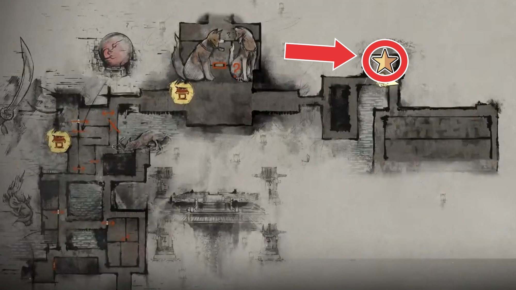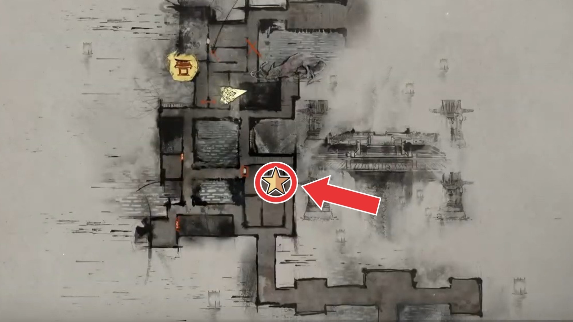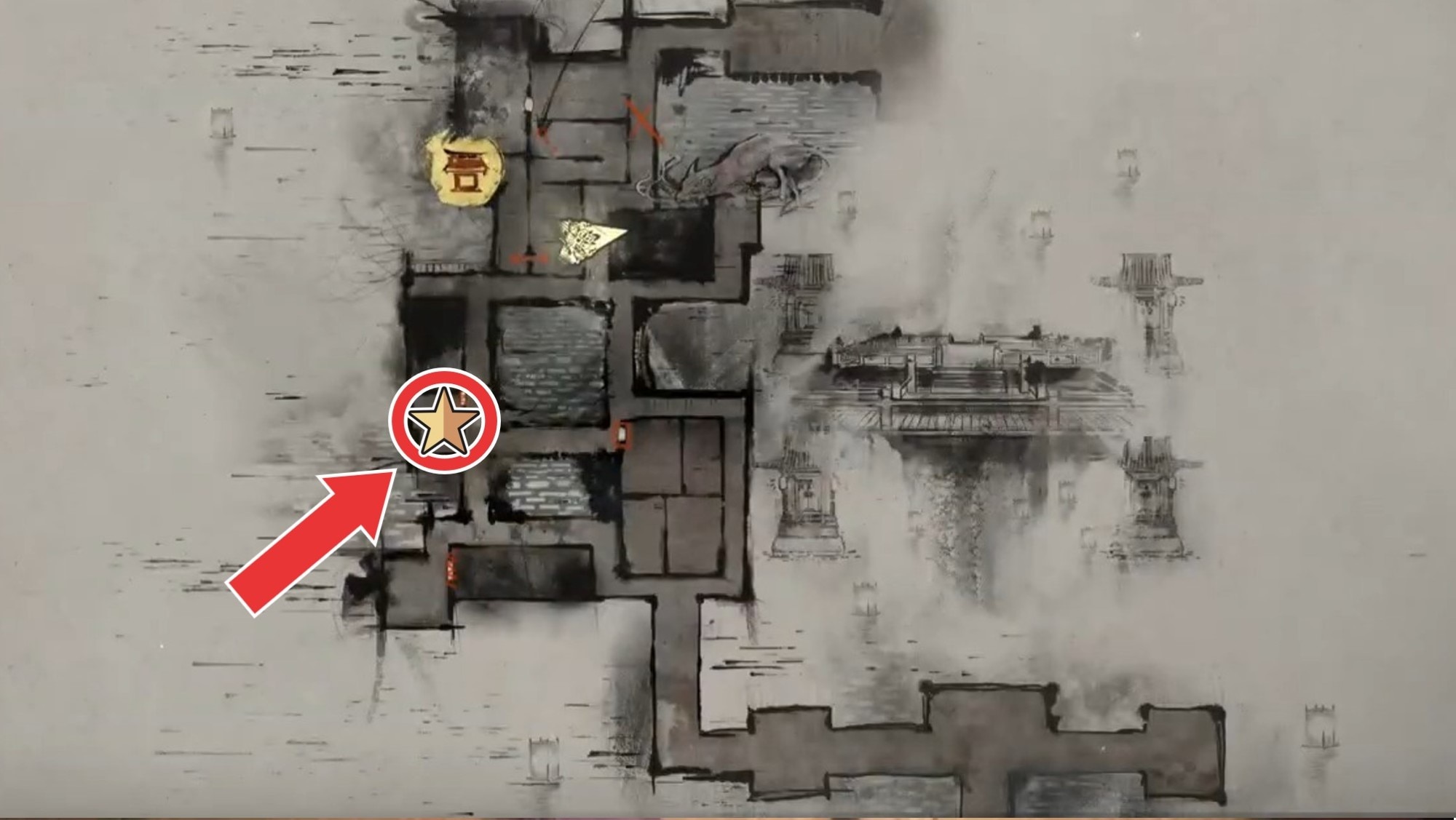 廻廊の祈願絵馬は、マップ左下の扉の近くにあります。扉の右にある箱の上に、祈願絵馬が落ちています。